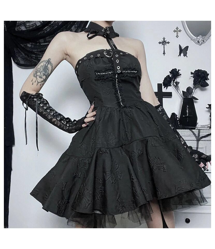 Black Gothic Punk Cross Jacquard Mesh Puffy Cake Dress And Choker Wholesale Dresses N5323031800010