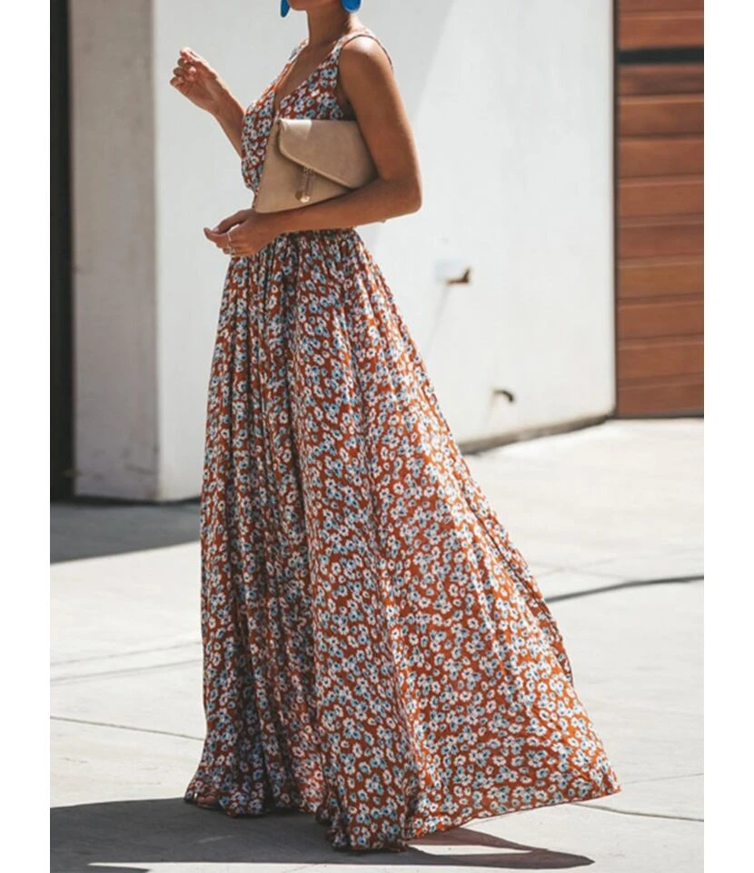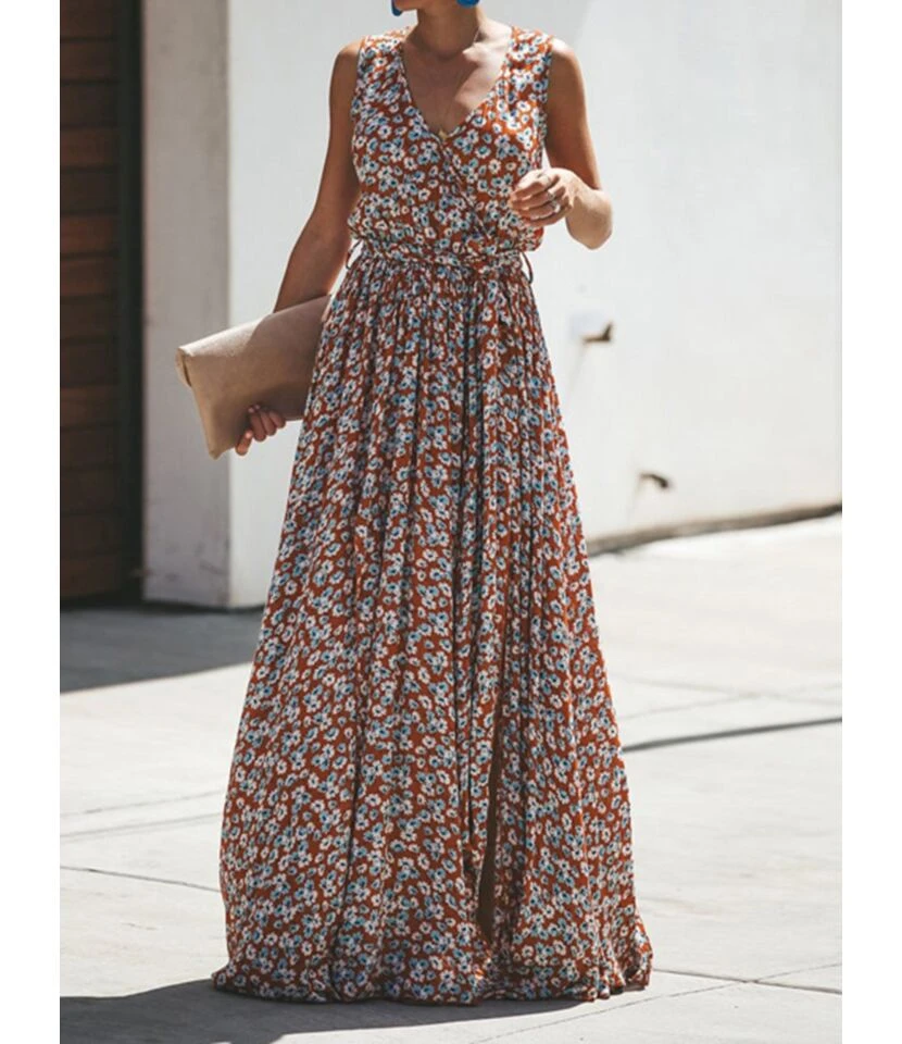 Bohemian V Neck floral Print Tie-up Split Maxi Dress