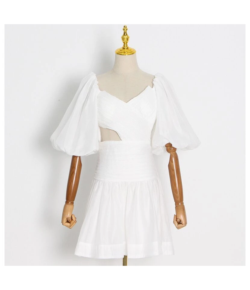 Bubble Sleeve Pleated Off Shoulder Short Tight Hollow A-Line Dress Wholesale Dresses N5323032300032