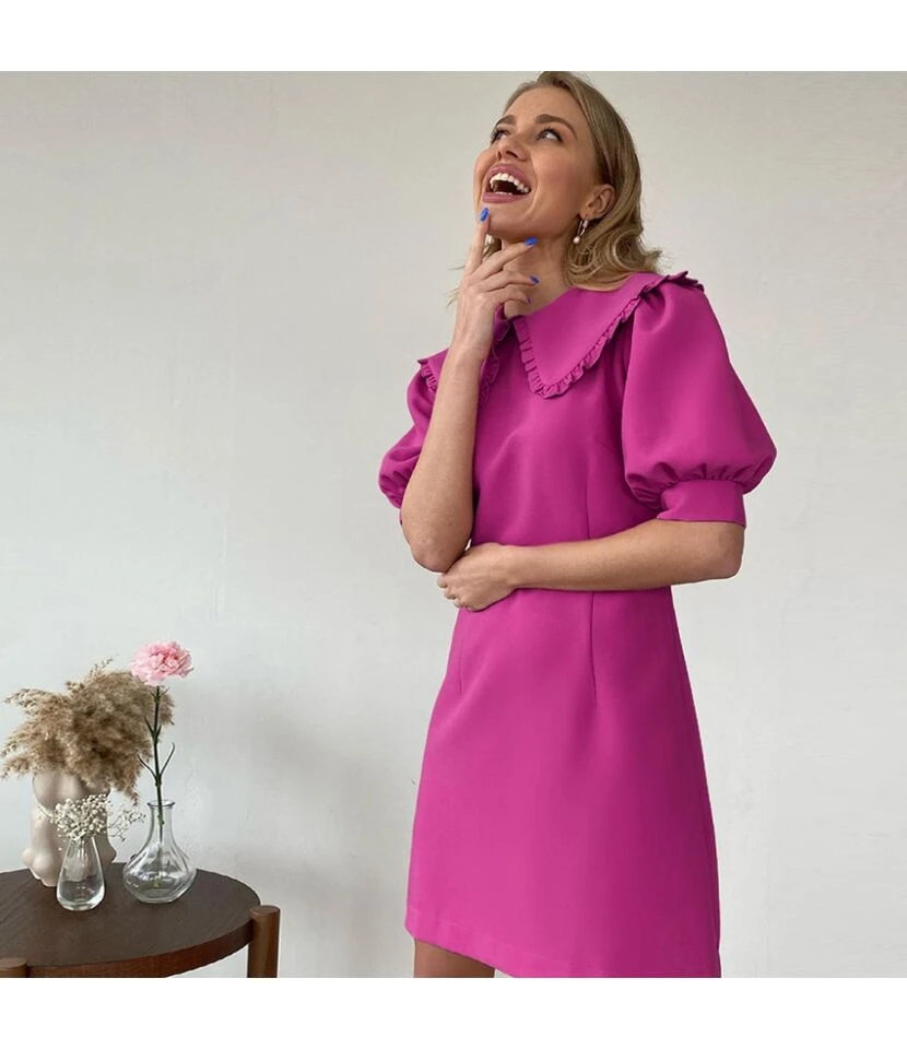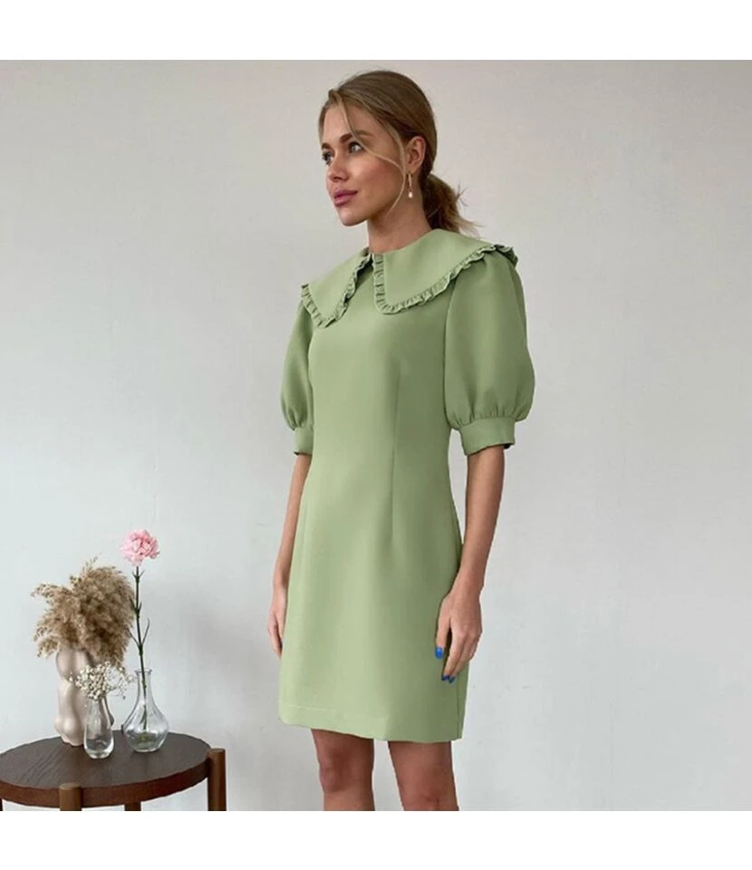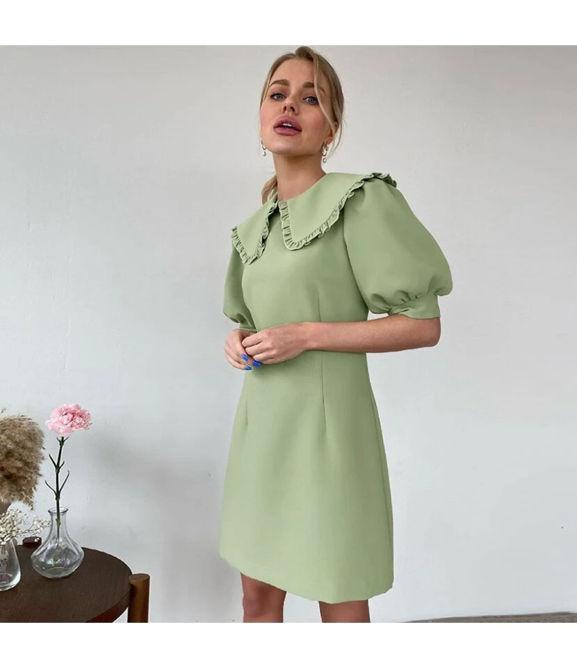 Casual Doll Neck Puff Sleeve A-Line Mini Dress High Waist Solid Color Wholesale Dresses SD58854