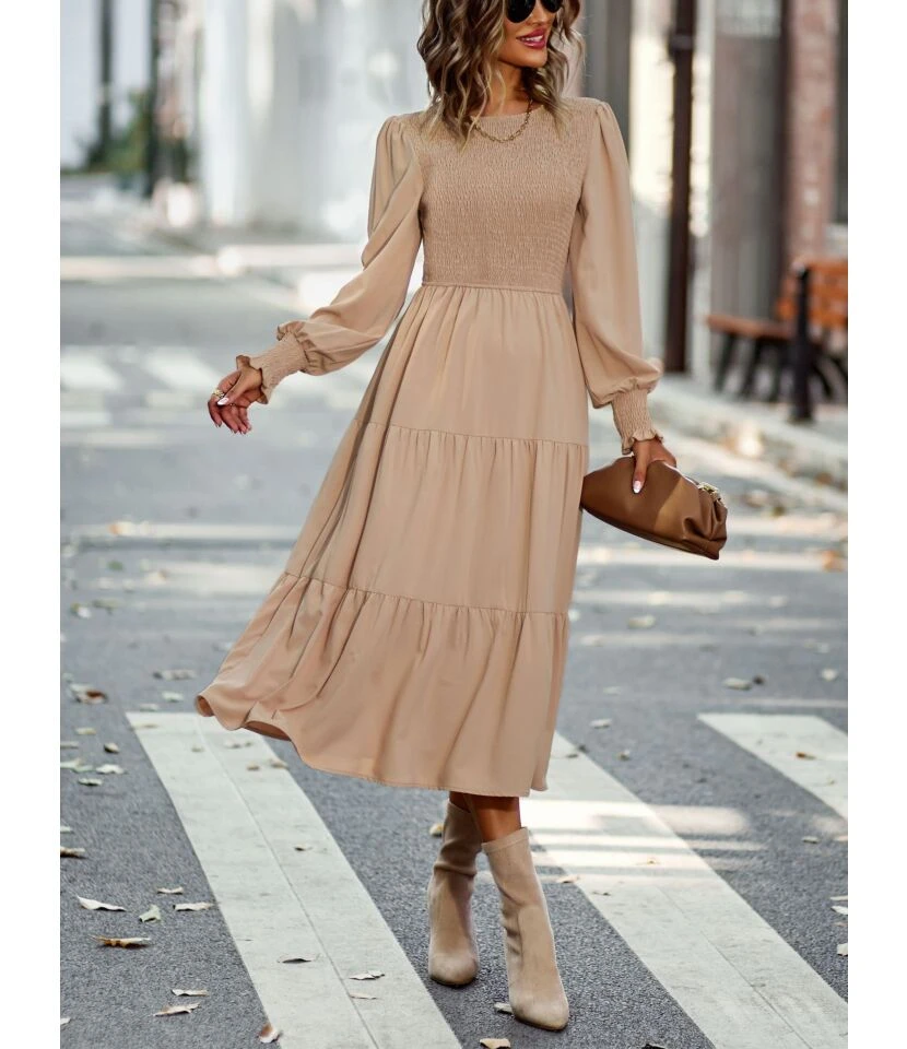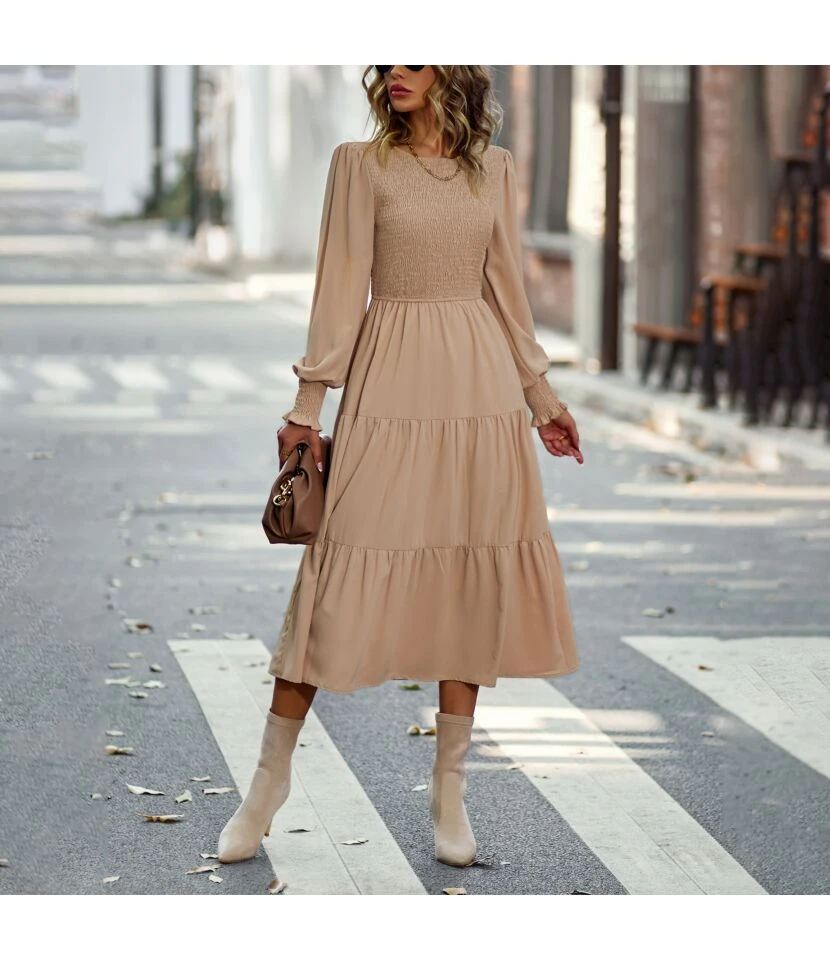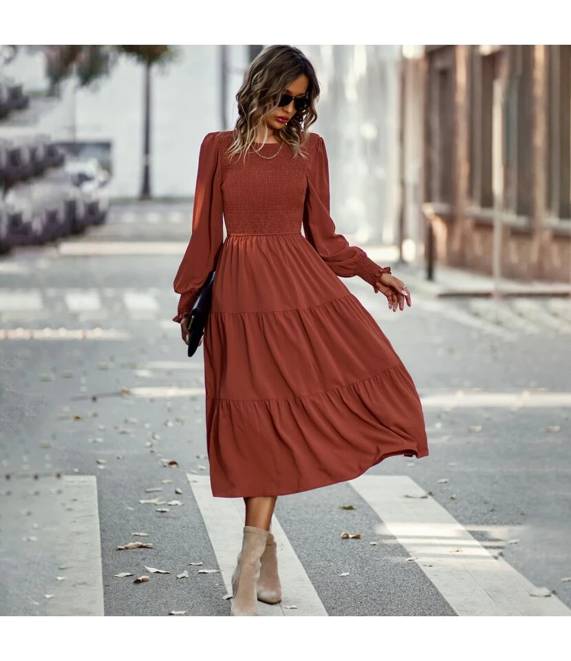 Casual High Waist Swing Midi Dress Long Sleeve Solid Color Wholesale Dresses SDN562290
