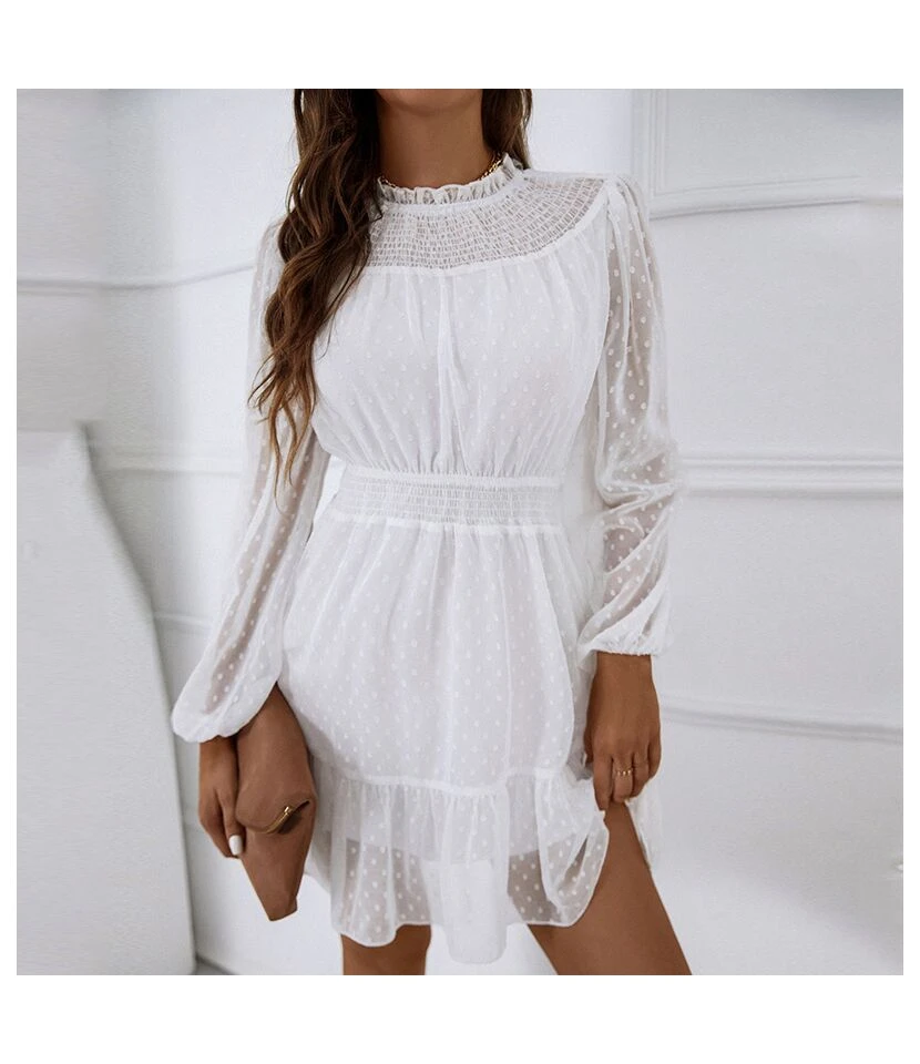Casual Lace Trim A-Line Dress Puff Sleeves High Waist Wholesale Dresses SDN561461
