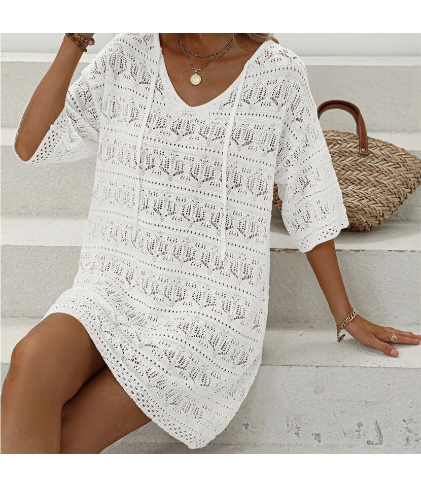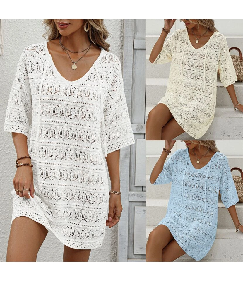 Casual Short-Sleeved V-Neck Hollow Vacation Beach Sunscreen Dress Wholesale Dresses V5923051300042