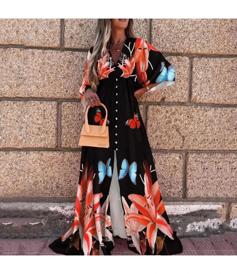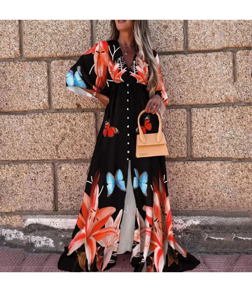 Casual V-Neck Print Maxi Dress Single-Breasted Long Sleeve Resort High Slit Wholesale Dresses SDN560693