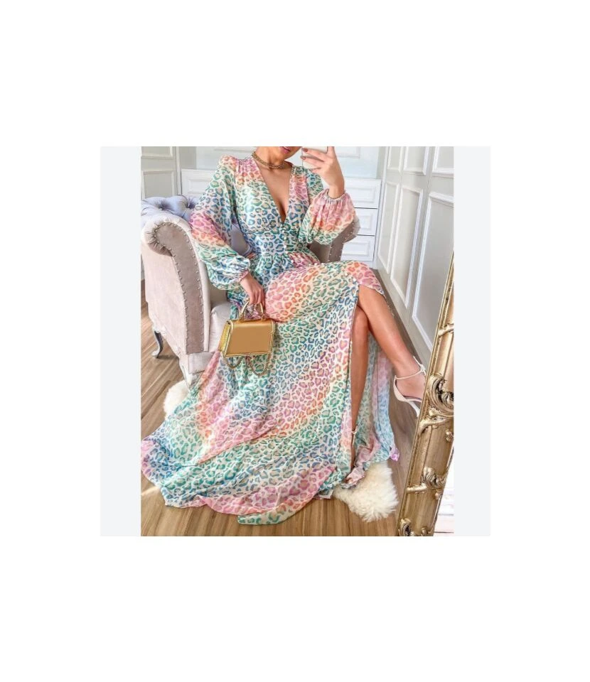 Colorful Leopard Print Deep-V Lantern Sleeve Slit Swing Dress Sexy Vacation Wholesale Maxi Dresses SD531915