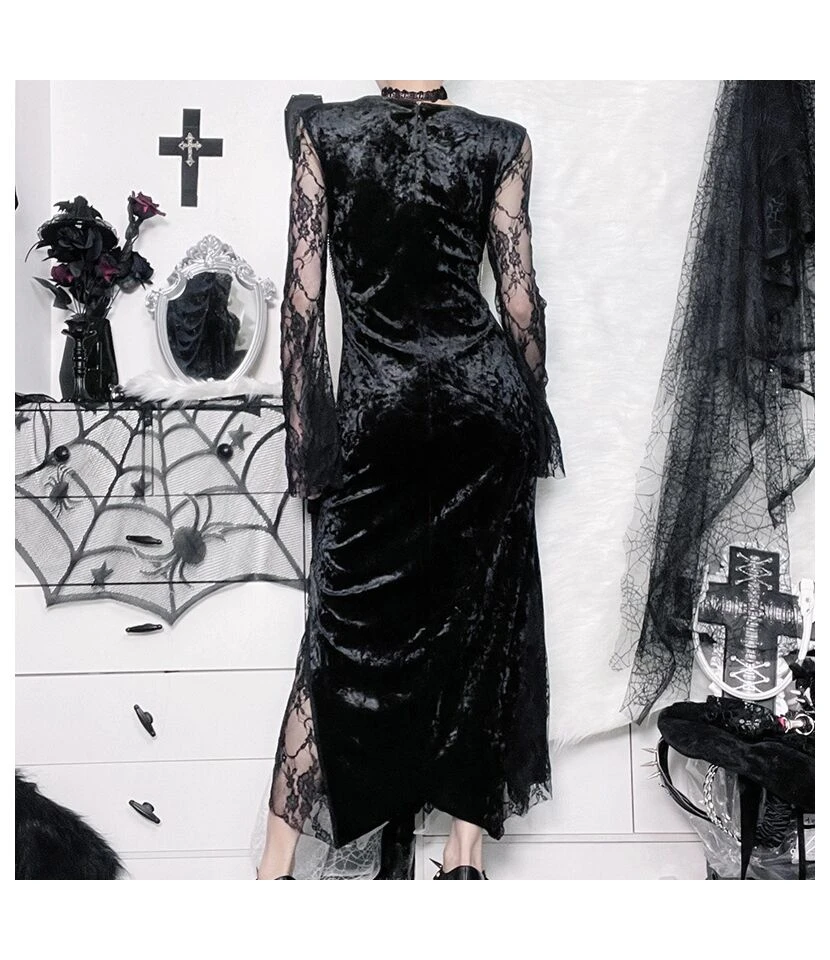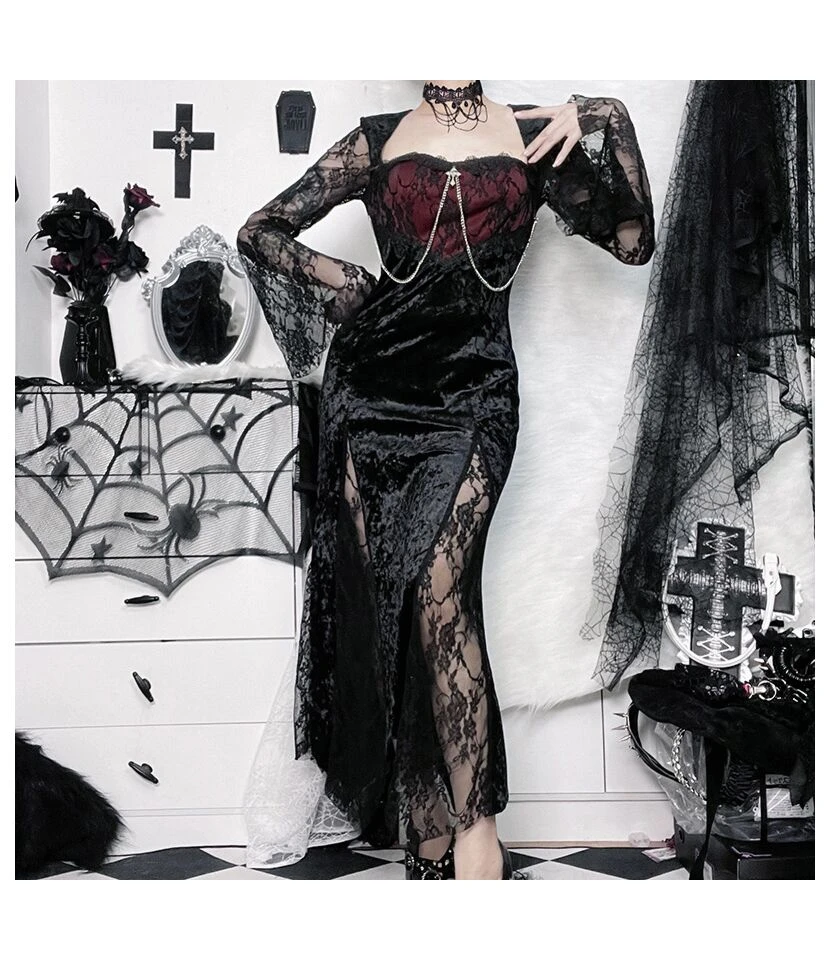 Dark Style Splicing See-Through Lace Slim-Fit Slit Trumpet Sleeve Dress Wholesale Dresses SDV464255