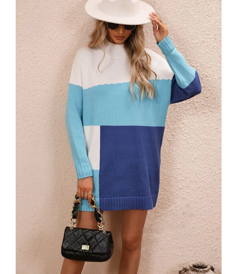 Elegant Colour Blocked Round Neck Knitted Long Dress Wholesale Dresses N5923082600022