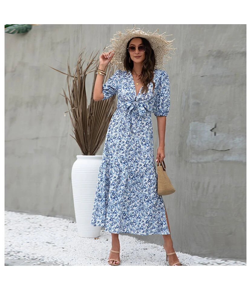 Elegant Lantern Sleeve Knotted Print Midi Dress Sexy V Neck Side Slit Wholesale Dresses SDN560361