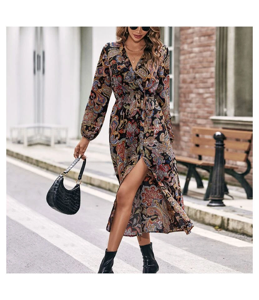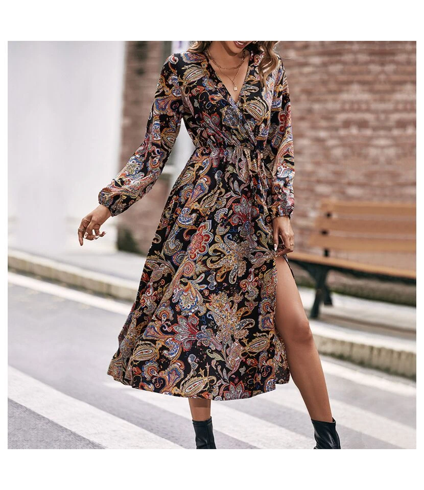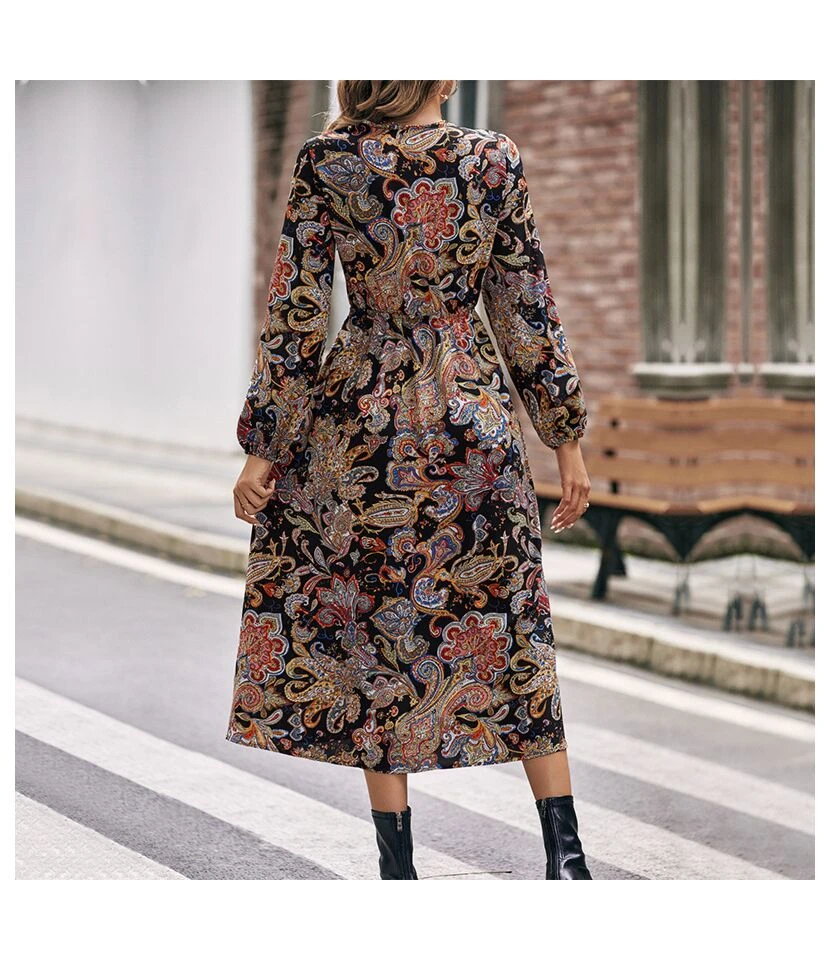 Elegant Long-Sleeved Fashion Printed Slim Slit A-Line Midi Dress Wholesale Dresses SDN538604