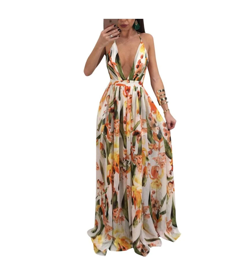 Fashion Print Deep V Neck Open Back Chiffon Beach Sling Wide Swing Dress Sexy Wholesale Maxi Dresses SD55497