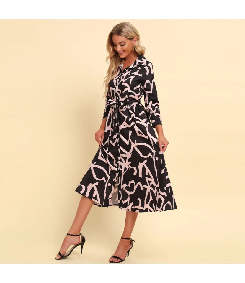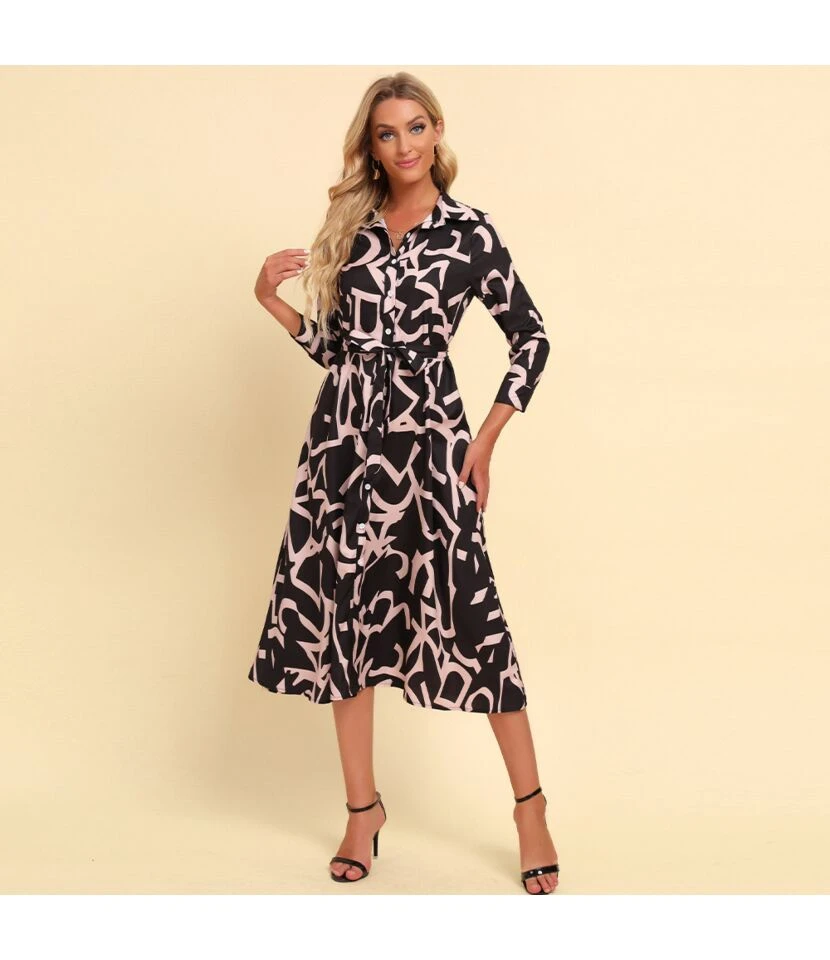 Fashion Print Lapel Midi Dress Single Breasted Casual Wholesale Dresses With Belt SDN560147