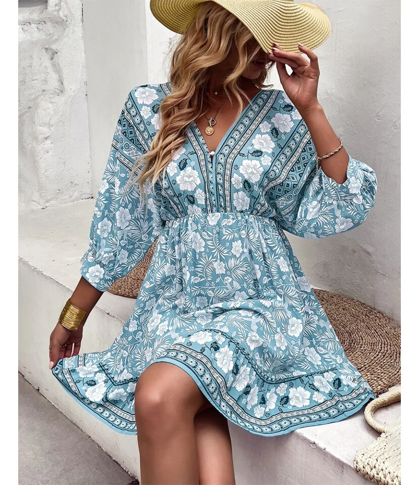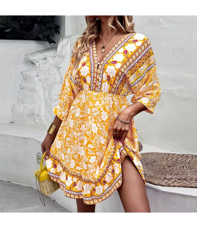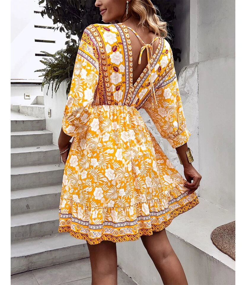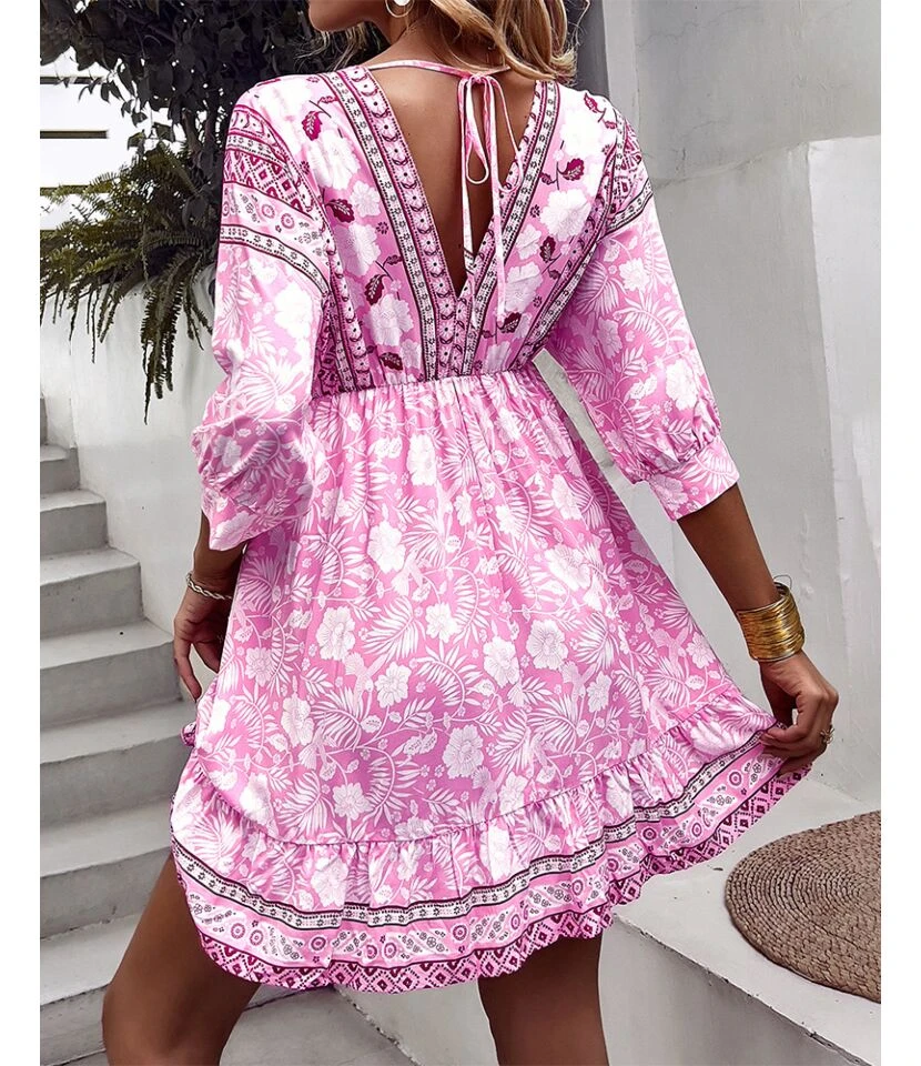 Fashion Print V Neck Swing Dress Casual Loose Backless Lace-Up Short Sleeve Wholesale Dresses