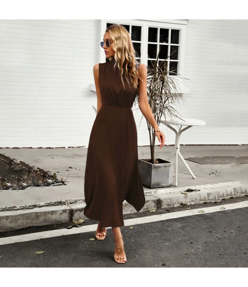 Fashion Sleeveless High Waist Half High Neck Satin Dress Wholesale Dresses V5923050300041