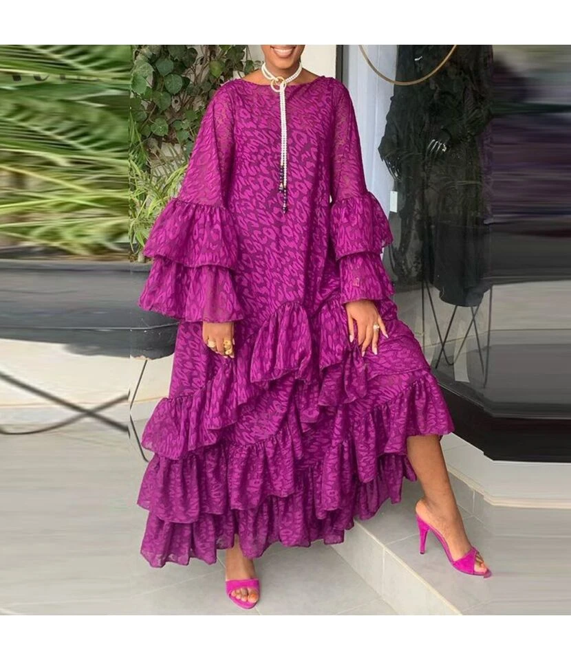 Flare Sleeve Printing Ruffled Trim Swing Long Dress SD080522