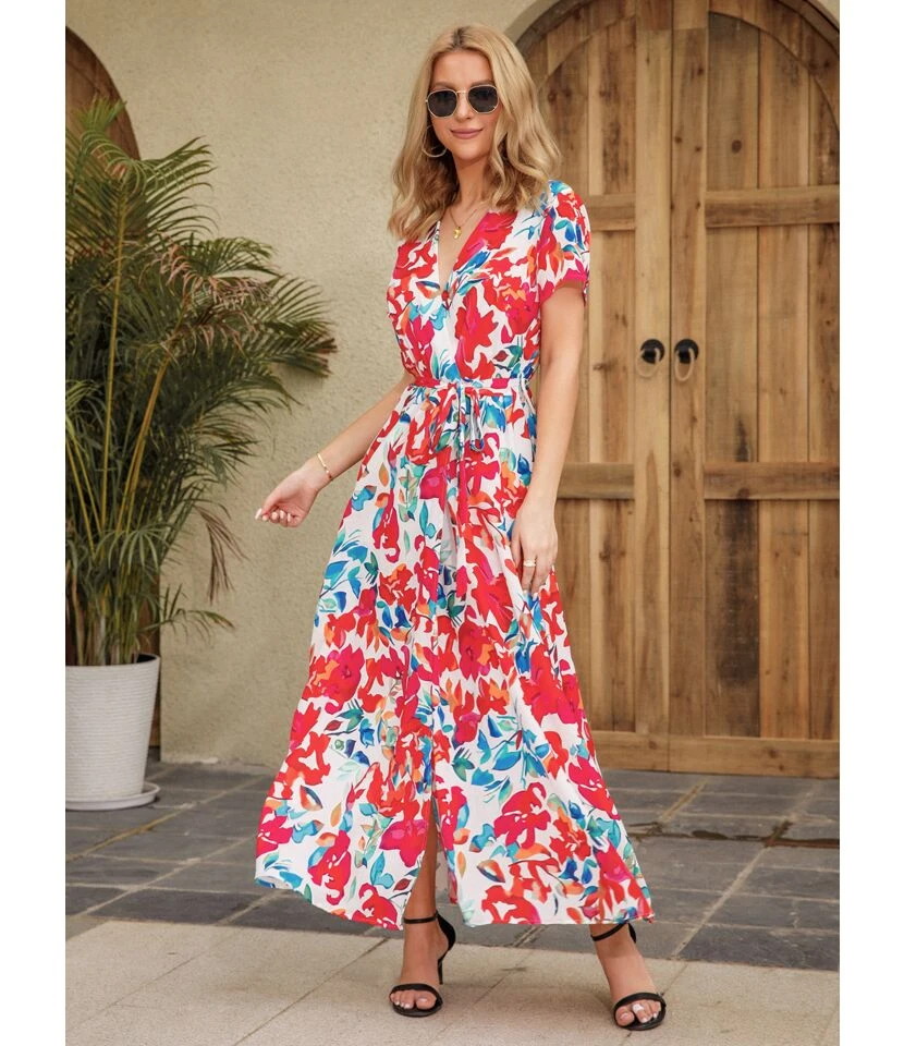 Floral Print Short Sleeve V Neck Tie-Up Waist High Slit Resort Dress Wholesale Maxi Dresses SDN533200