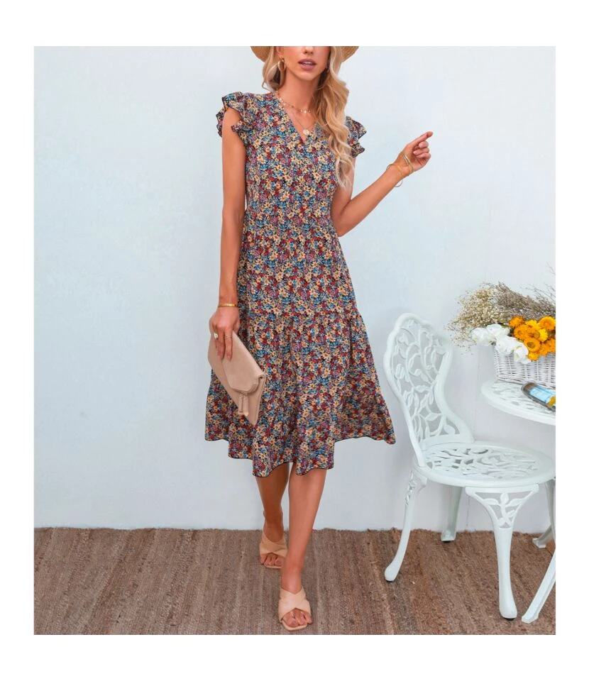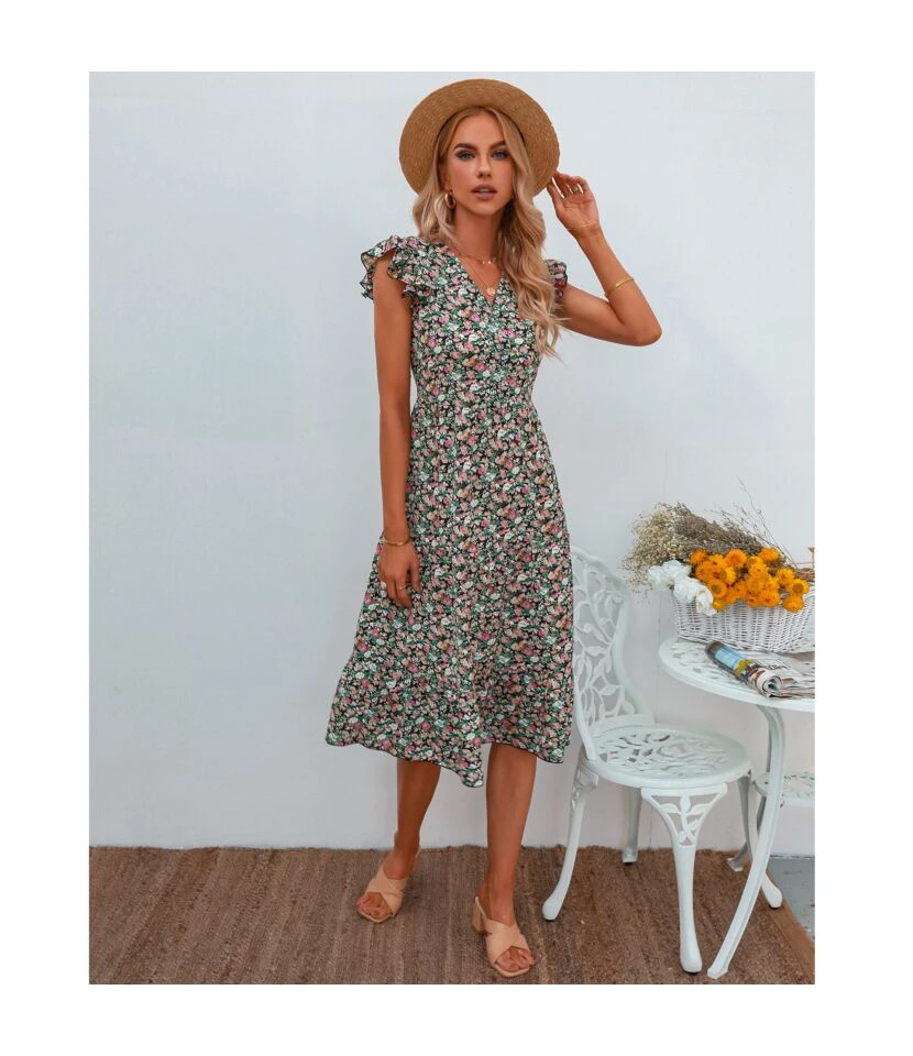 Floral Print V-Neck Frill Sleeve Midi Swing Dress Casual Summer Wholesale Dresses SD204674