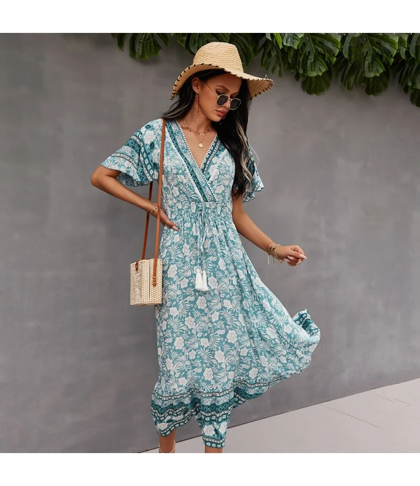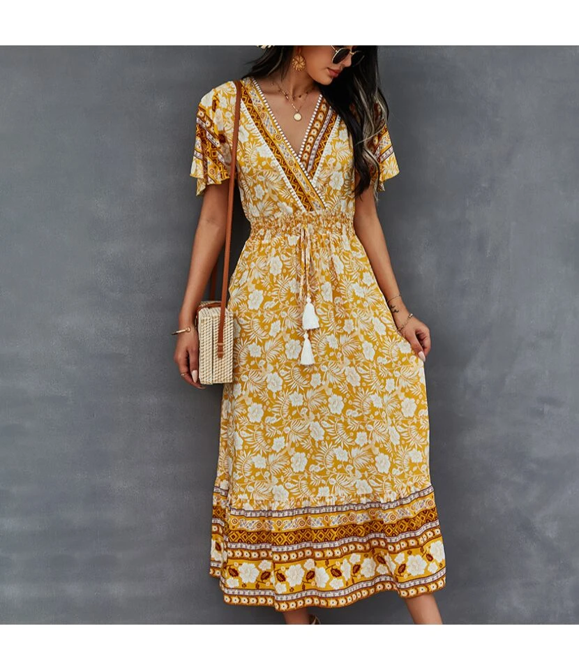 Floral Print V Neck Fringe Tie-Up Short Sleeve Resort Dress Wholesale Womens Boho Dresses SDN533139
