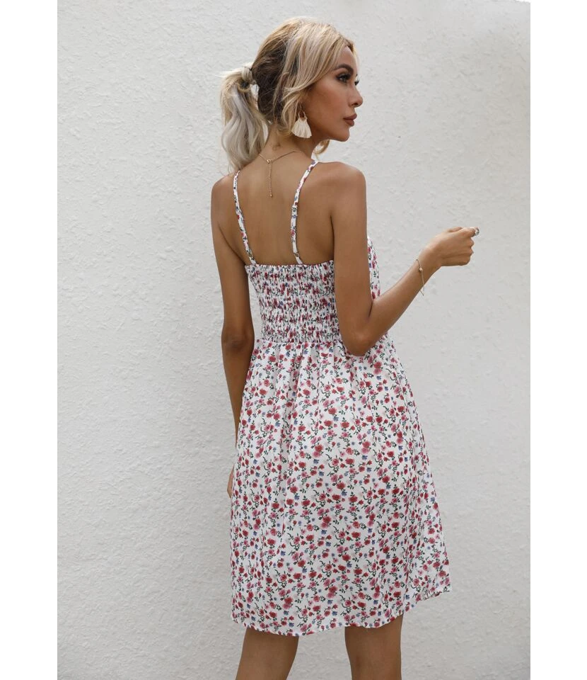 Flower Print Sling V-Neck Nipped Waist Summer Midi Swing Dress Wholesale Dresses SDN533524