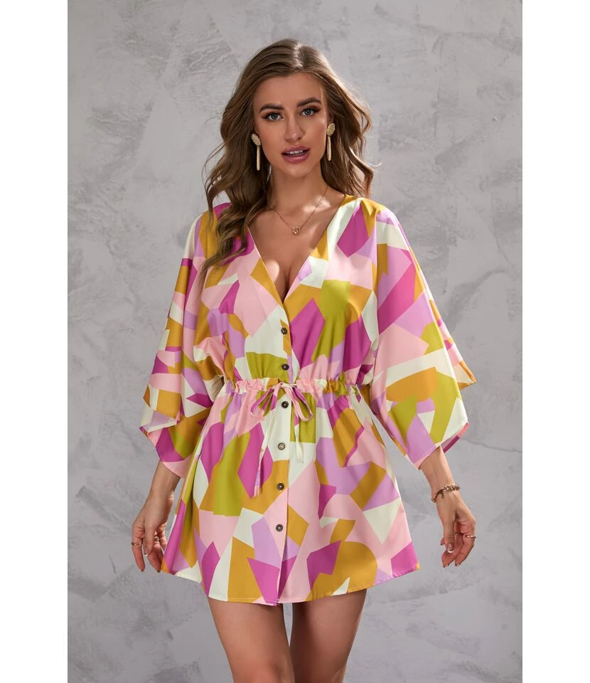 Geometric Print Deep-V Half Flare Sleeve Lace-Up Drawstring Mini Dress Resort Wholesale Dresses SDN533159