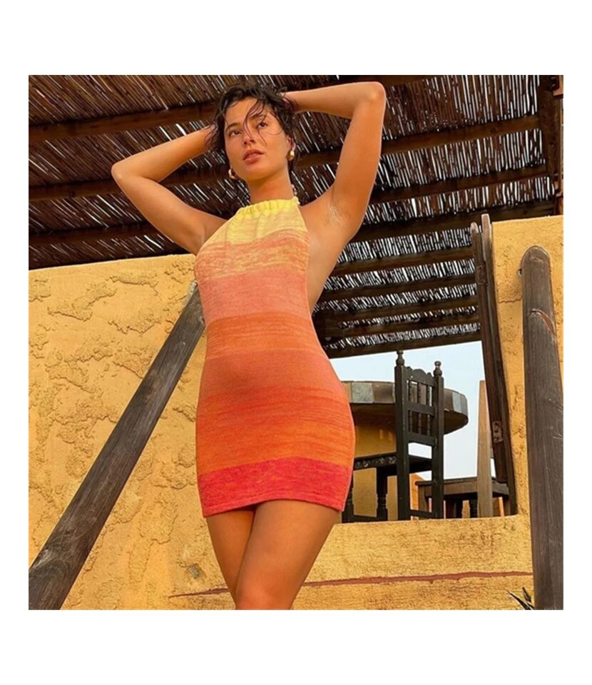 Gradient Sunset Print Halterneck Open Back Sling Pack Hip Knit Bodycon Dress Sexy Wholesale Jersey Dresses SDN532878