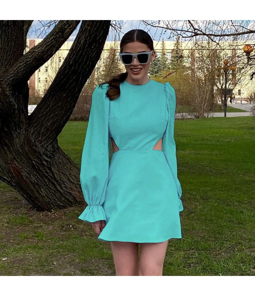 Lantern Sleeve Hollow Solid Color Commuter Niche A-Line Dress Wholesale Dresses N463823021400186