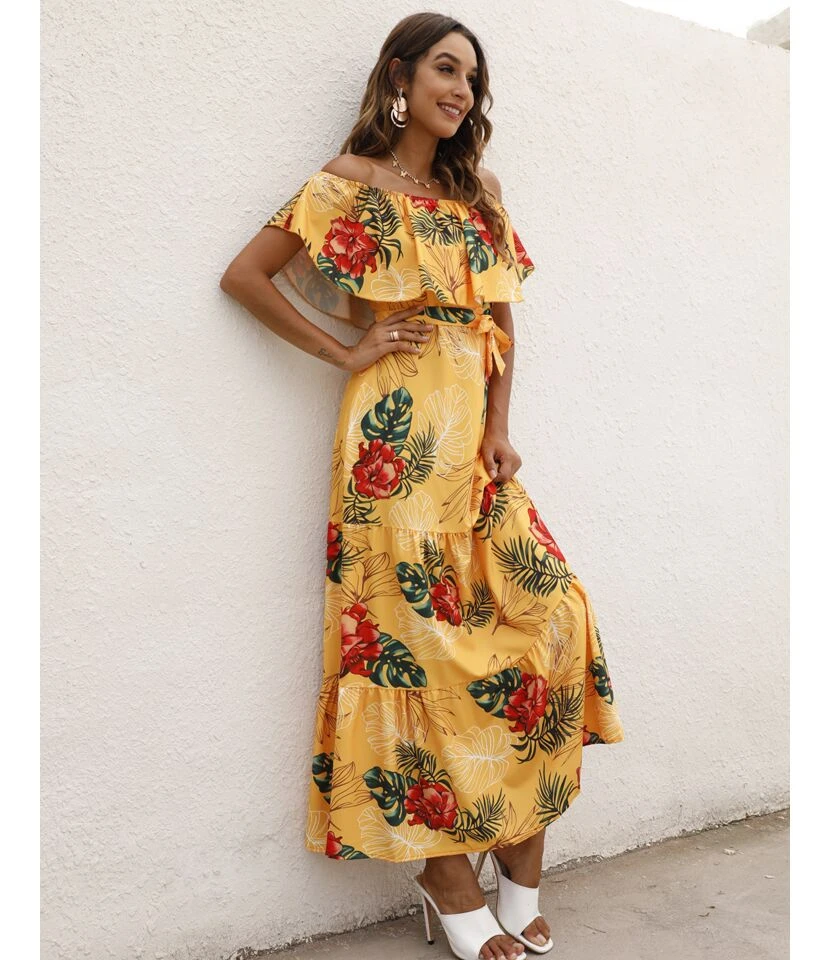 Leopard & Floral Printed Off Shoulder Ruffled Wide Lapel Resort Dress Wholesale Maxi Dresses SDN533198