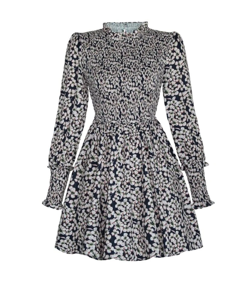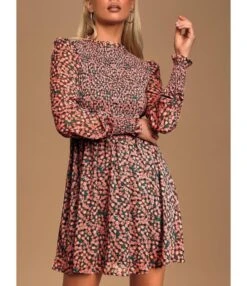 Features: Floral print, long sleeve, mock neck, high waist, midi length, fit and flare dress.