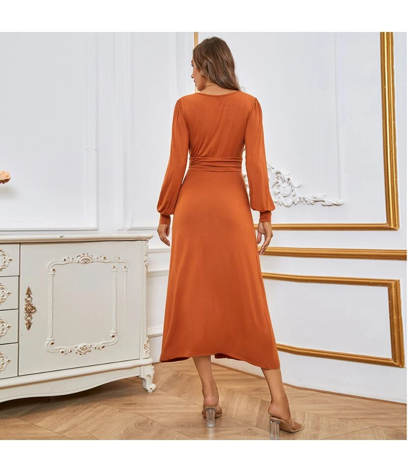 Long-Sleeved Simple Sexy V-Neck Slit Slim-Fit Temperament A-Line Dress Wholesale Dresses SDV464516