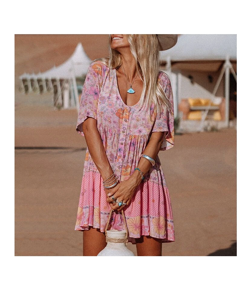 Loose Short Sleeve V-Neck Floral Print Dress Wholesale Dresses N4623051900042