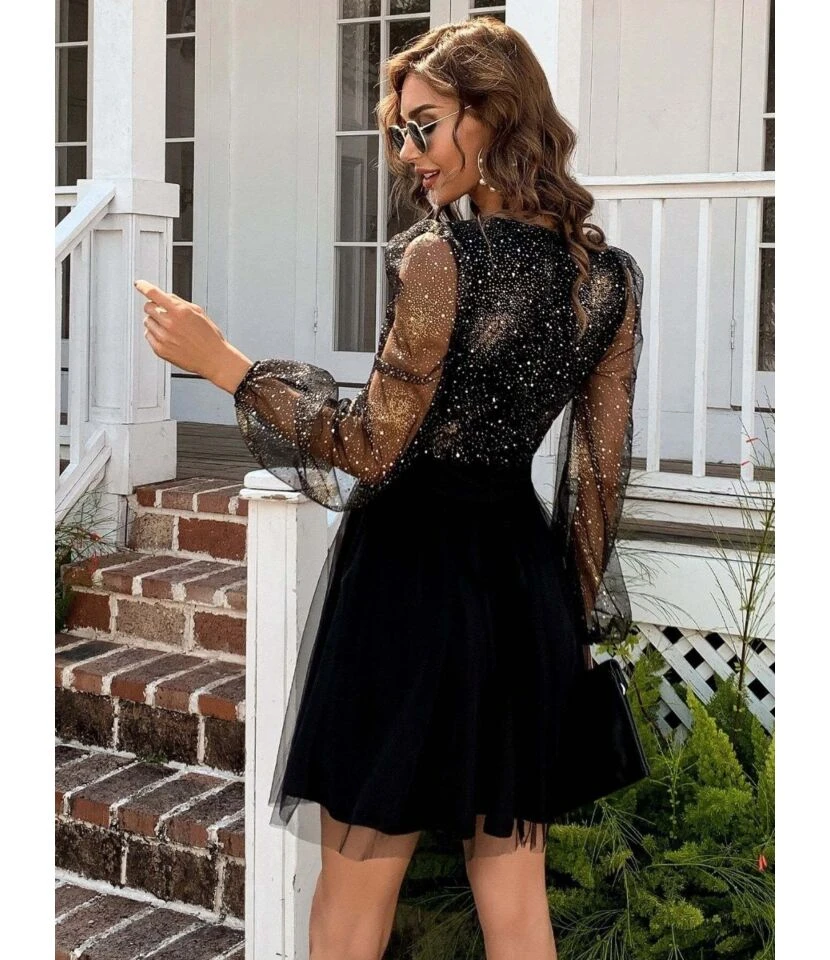 Mesh Lantern Long Sleeve Sexy Deep V Sequin Dress Wholesale Dresses SDN536449