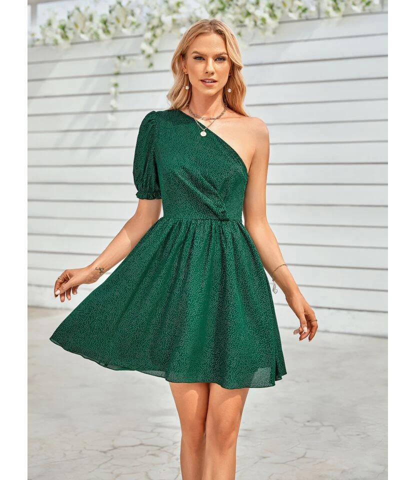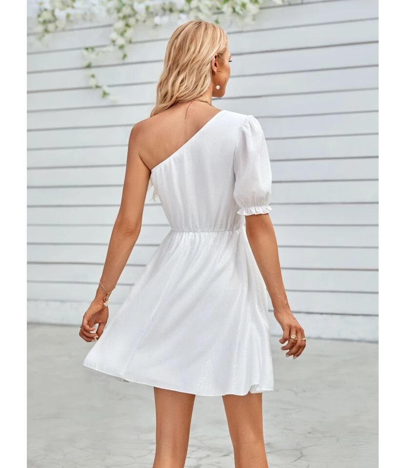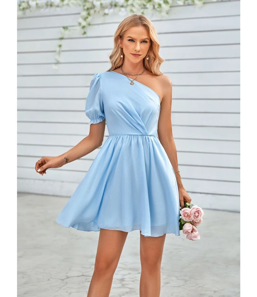 One Shoulder Puff Sleeve Solid Color Waist Swing Dress Wholesale Dresses SDN538808