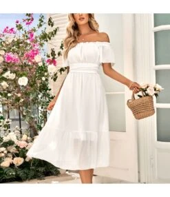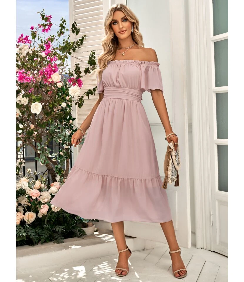 One Shoulder Solid Color Waist Vacation Flowy Dress Wholesale Dresses SDN539976