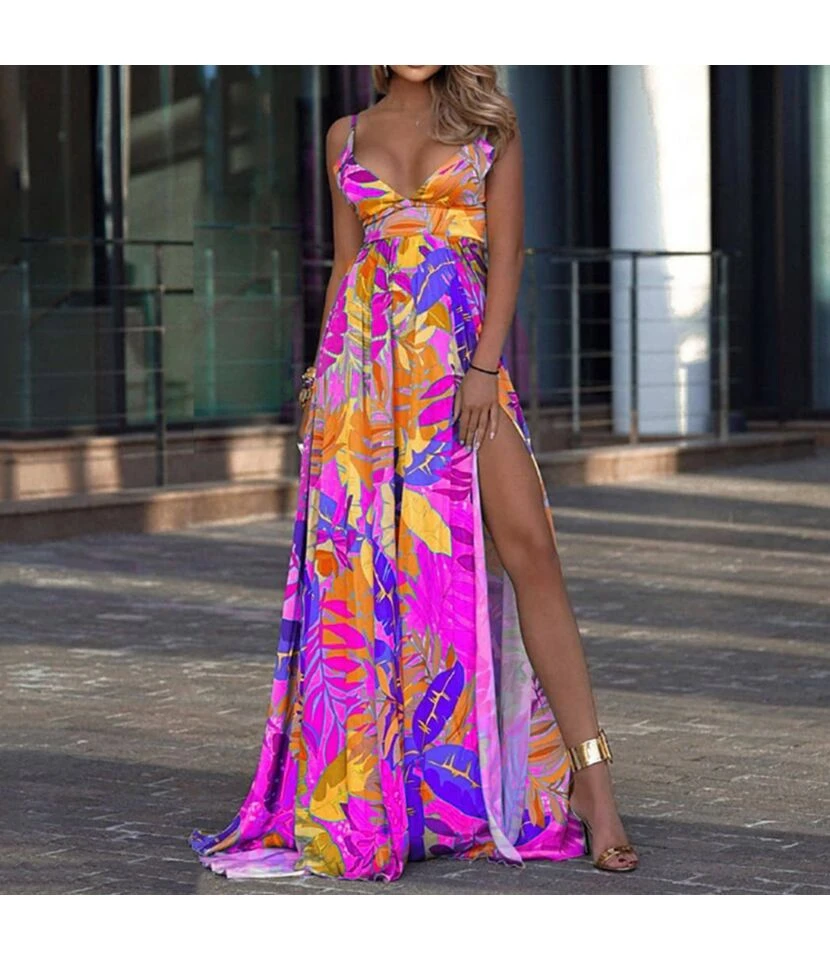 Palm Leaves Print Low Cut Sling High Waist Slit Swing Dress Resort Sundresses Wholesale Maxi Dresses SDN533008
