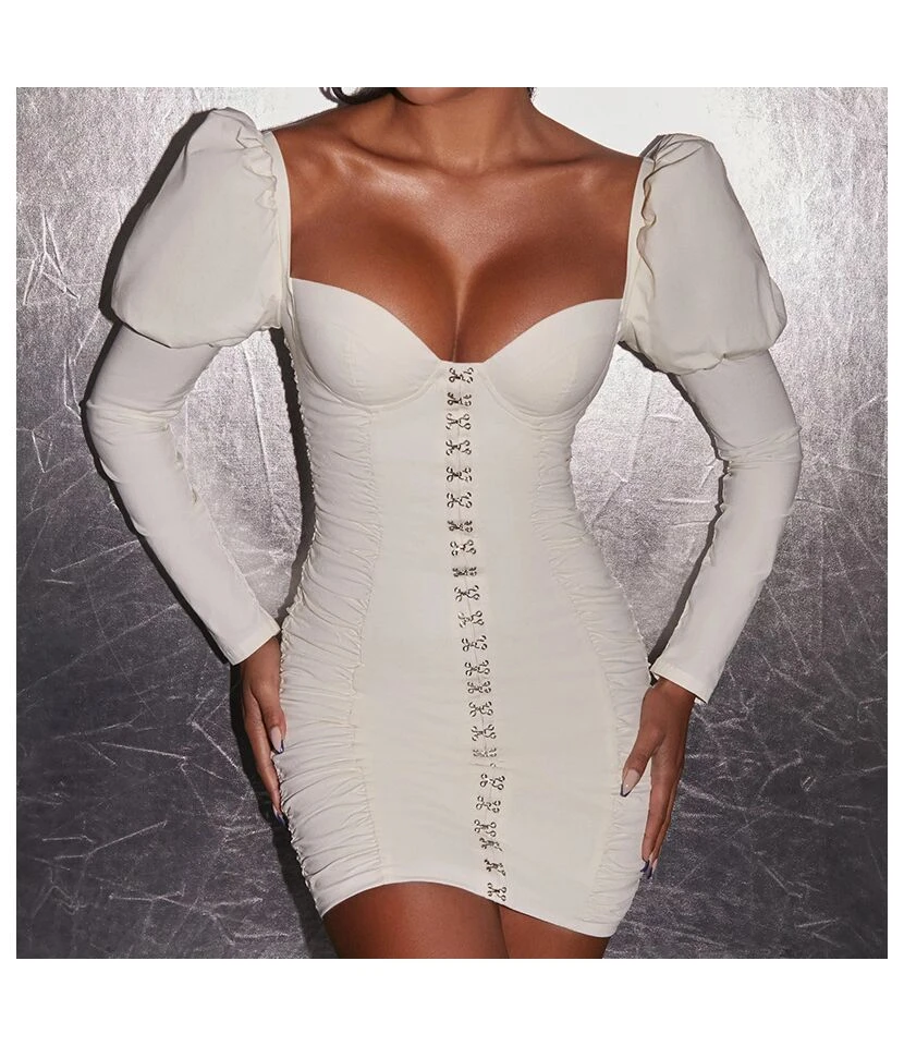 Pleated Sexy Low Cut Long Sleeve Puff Sleeve Sheath Mini Dress Wholesale Dresses SDV463783