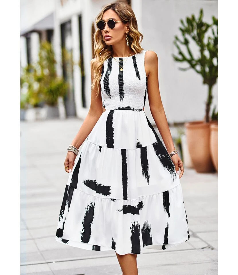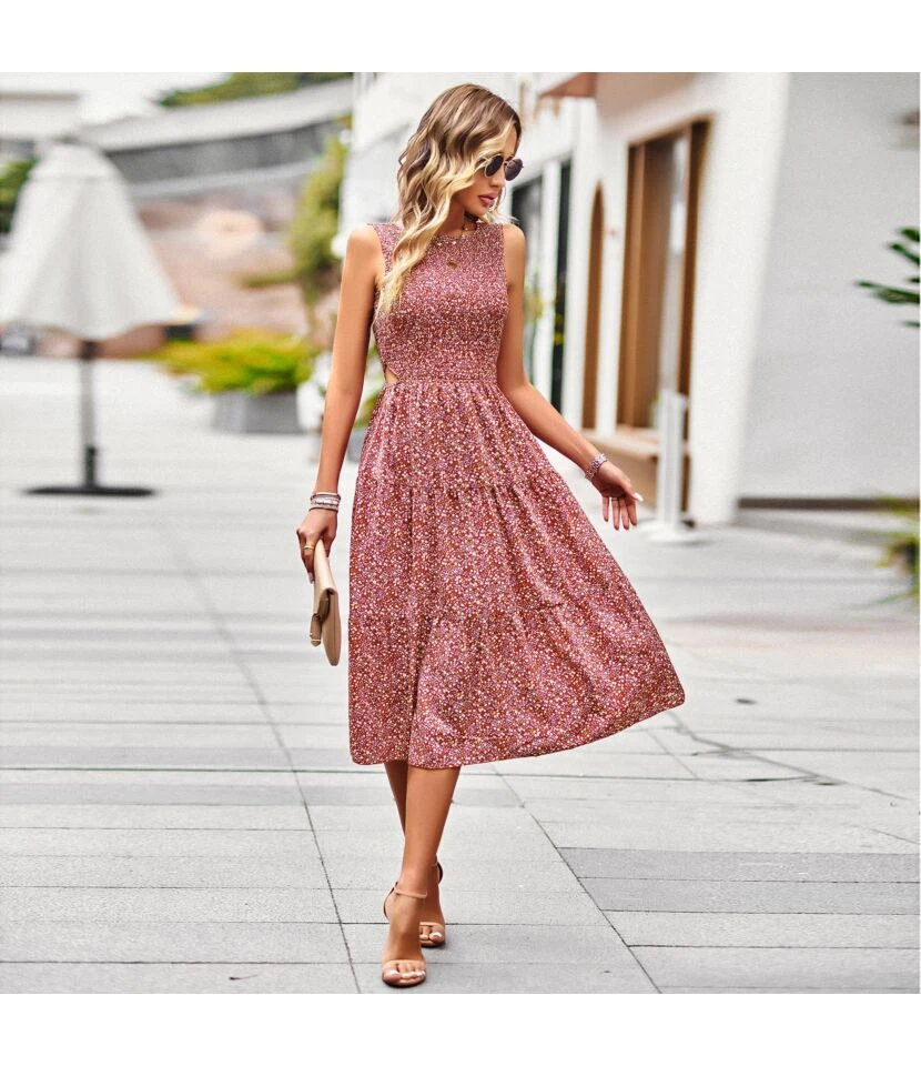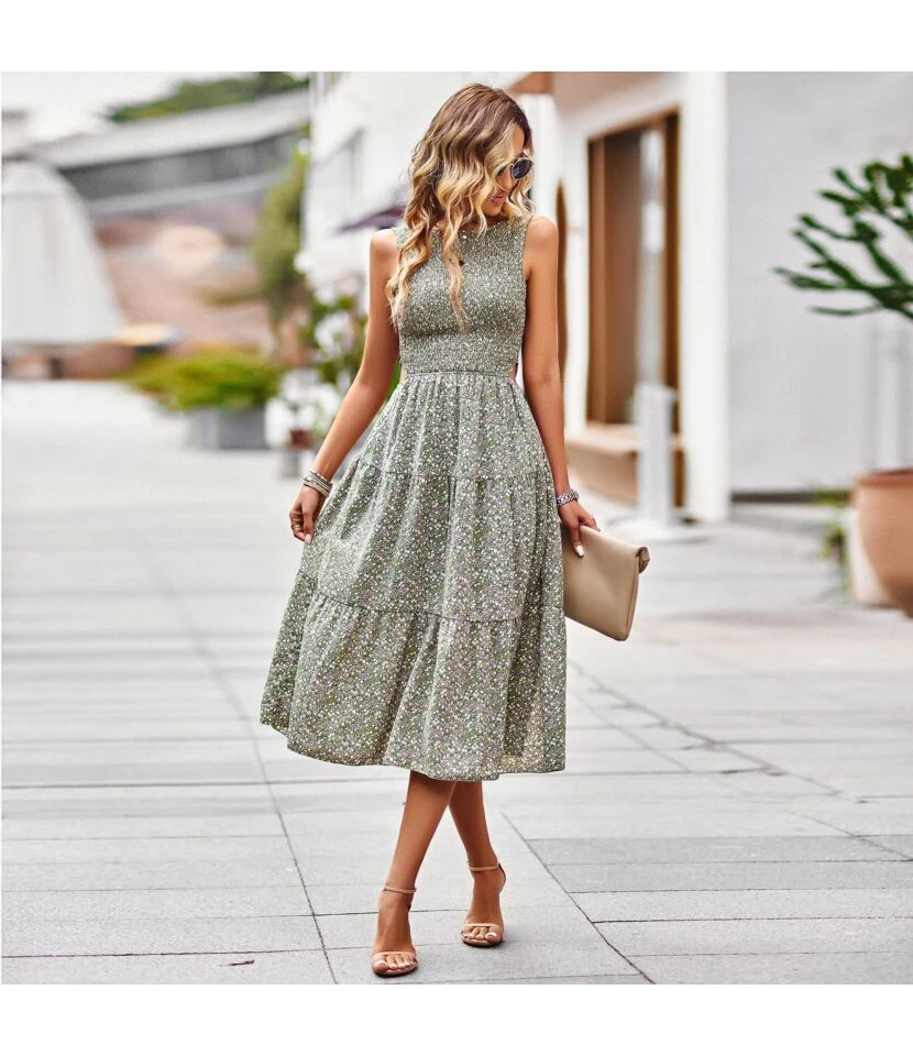 Printed High Waist Elegant Sleeveless Midi Tank Smocked Dress Wholesale Dresses N5323022700051