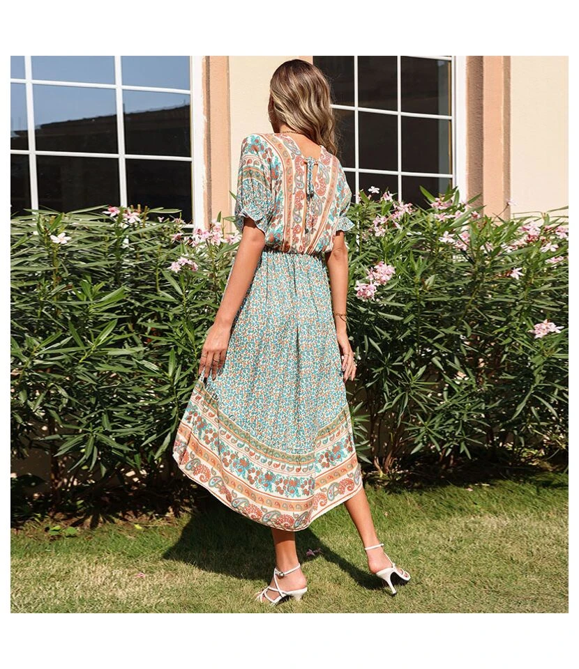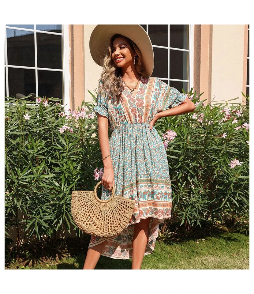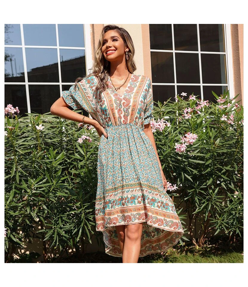 Printed Irregular Hem Boho Dresses V Neck Puff Sleeve Casual Vacation Wholesale Bohemian Dress For Women SD168359