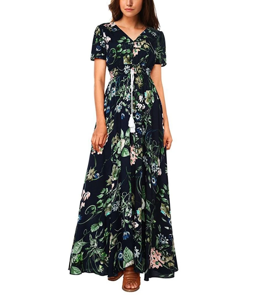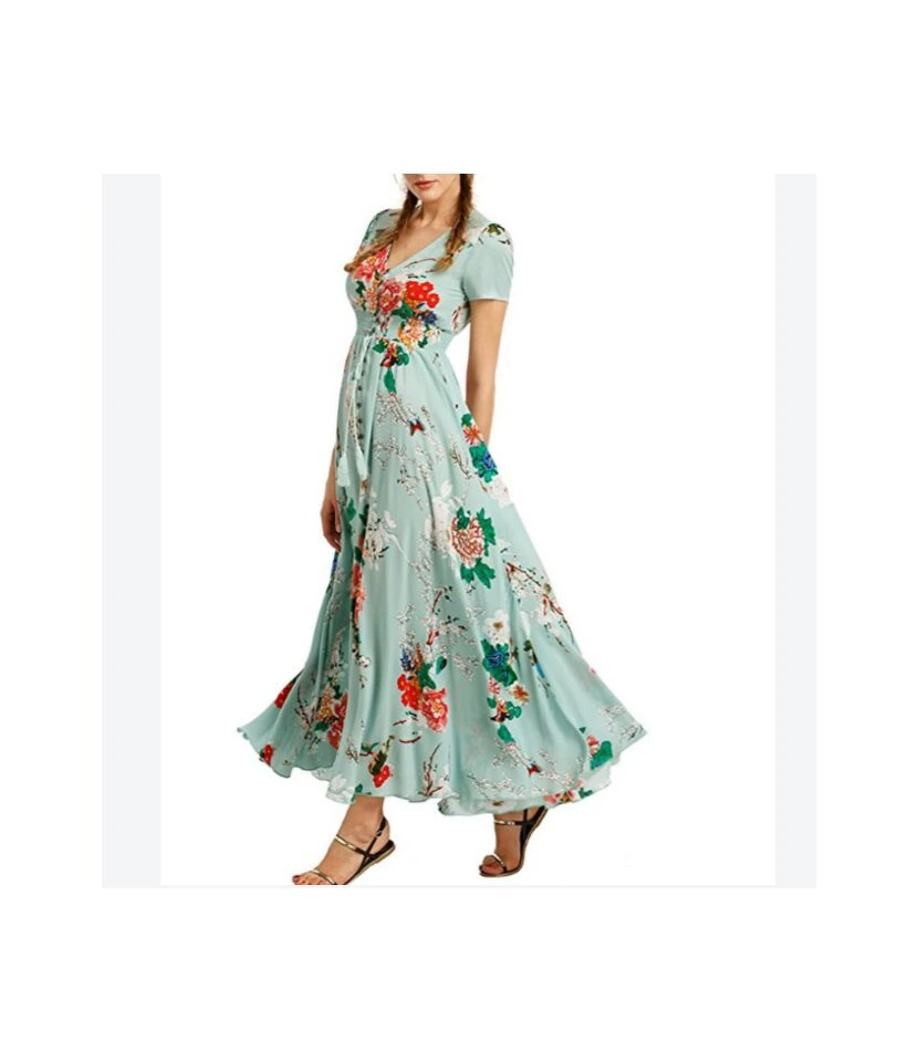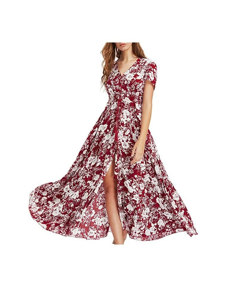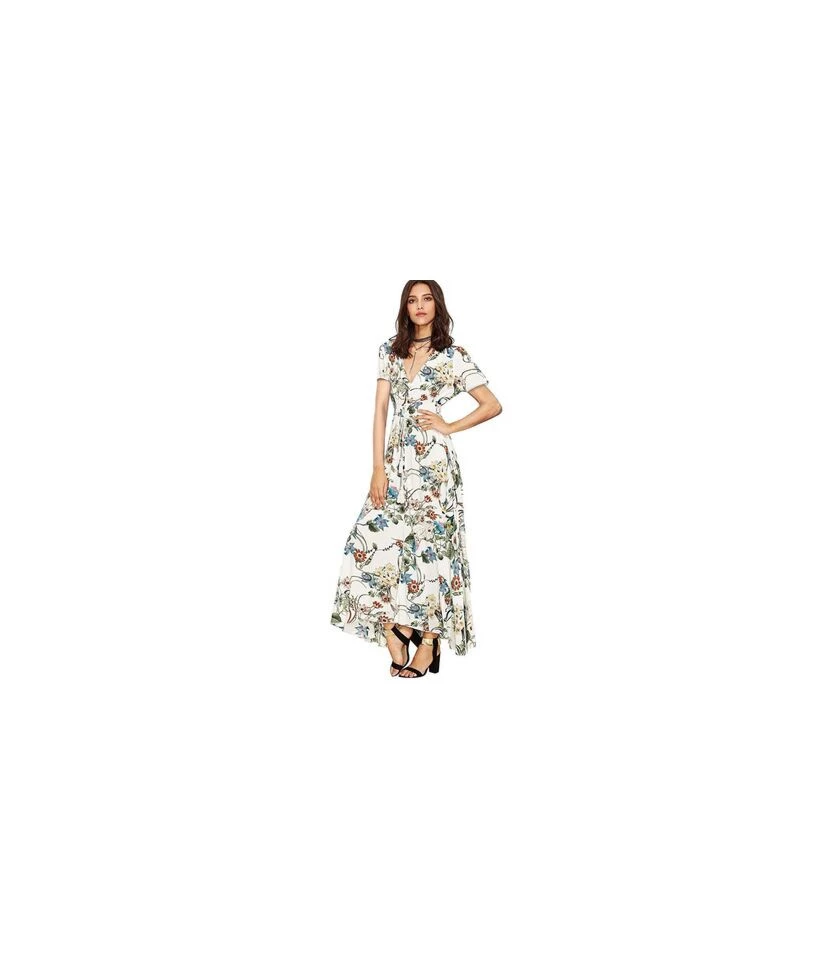 Printed Retro V-Neck Wide Hem Slit Design Wholesale Maxi Dresses Vacation Dress Trendy SD204093