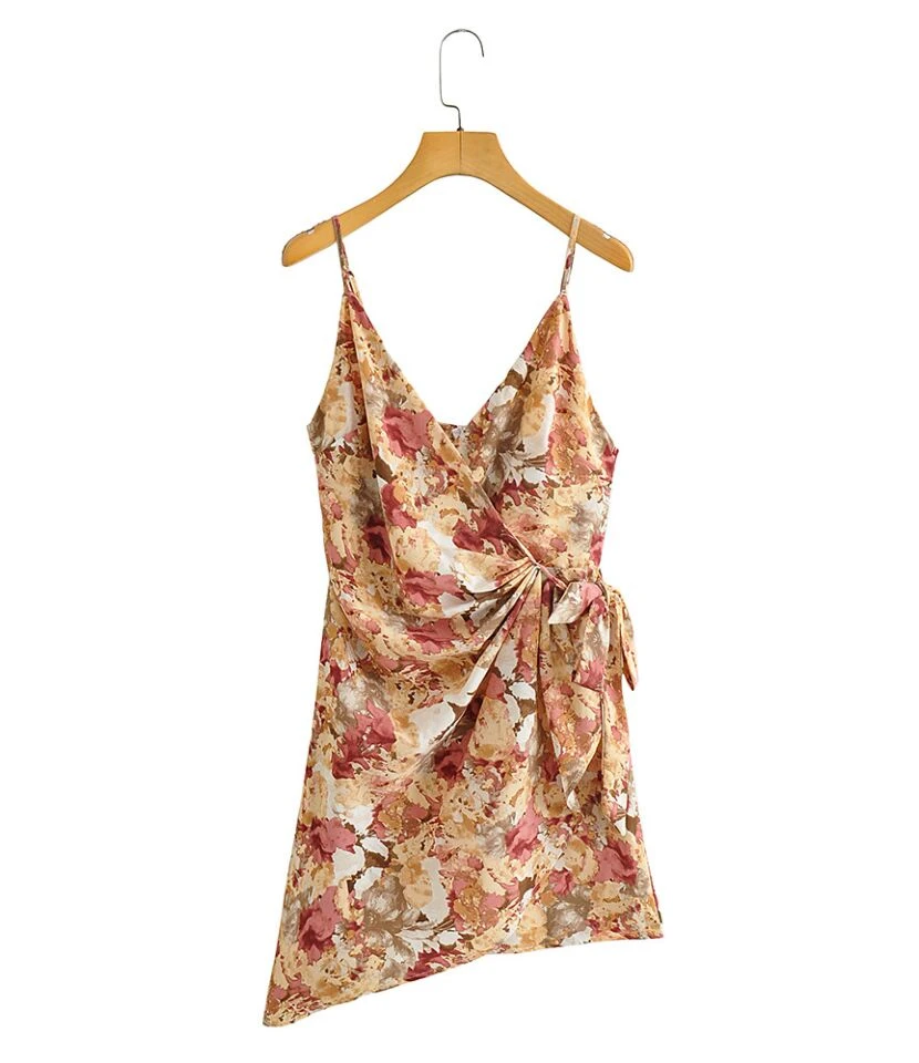Printed Sling Deep-V Neck Side Knotted Pleated Bag Hip Mini Dress Sexy Wholesale Dresses SDN533231