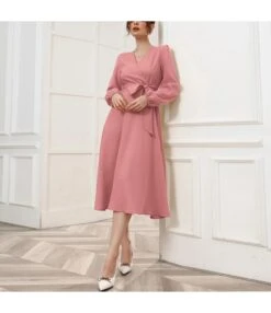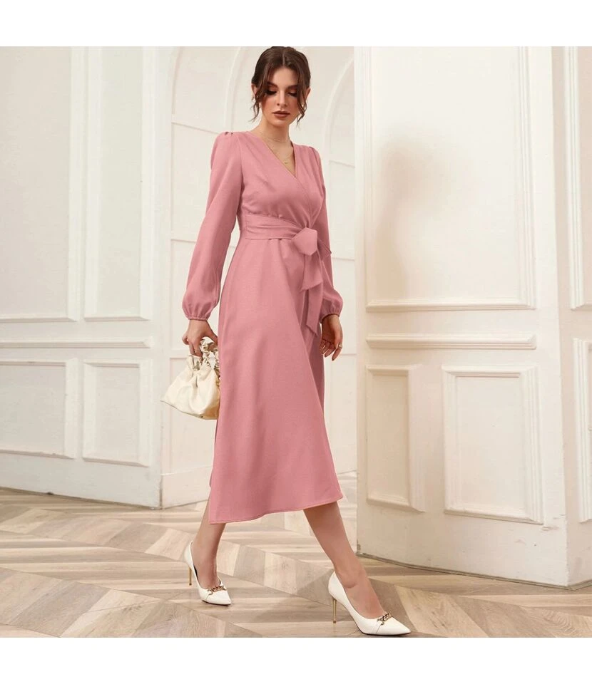 Puff Sleeve V-Neck Wide Swing Ladies Midi Dress With Belt Elegant Business Casual Women Wholesale Dresses SD204568