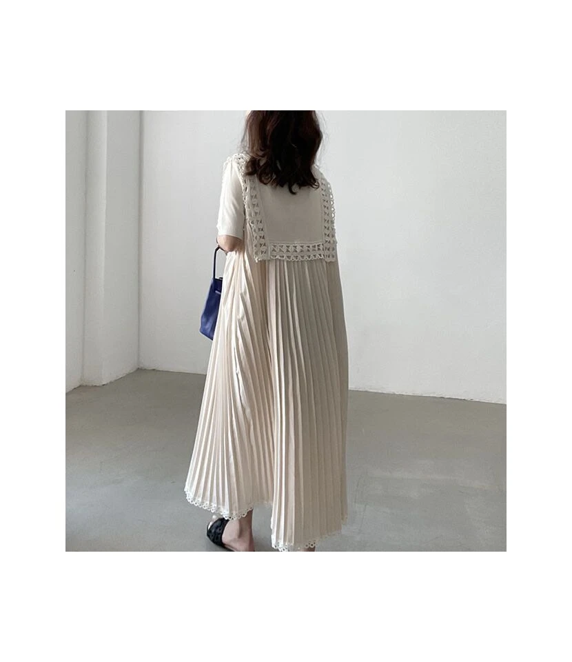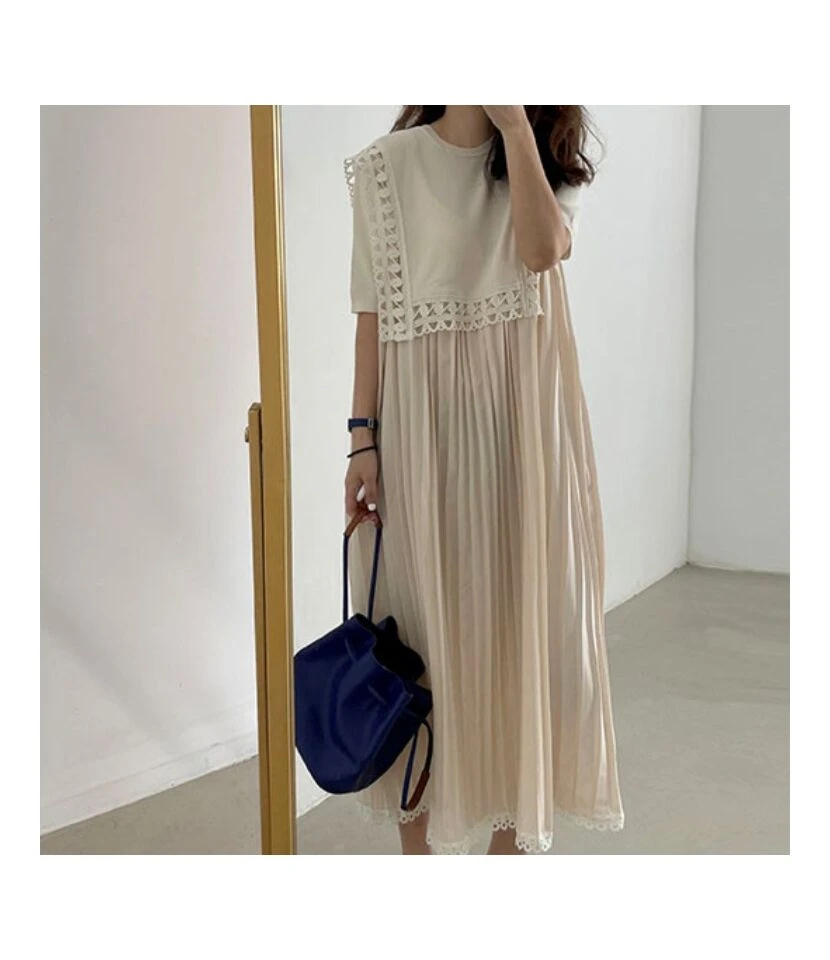 Retro Lace Stiching Pleated Hem Casual Loose Midi Dress Short Sleeve Wholesale Dresses SD204473