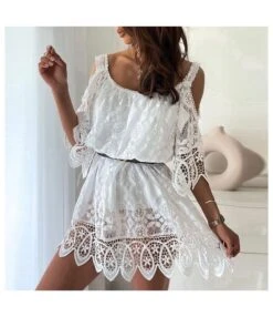 Sexy Off-Shoulder Sling Lace Mini Dress Hollow Lace-Up Solid Color Wholesale Dresses SDN561715