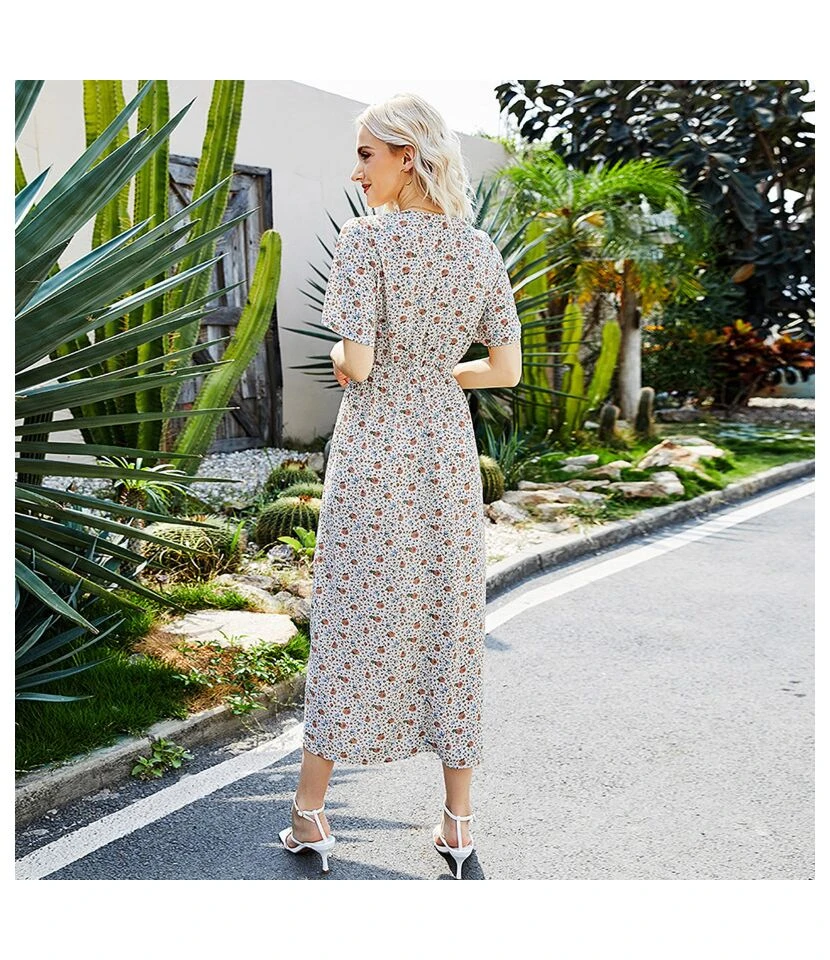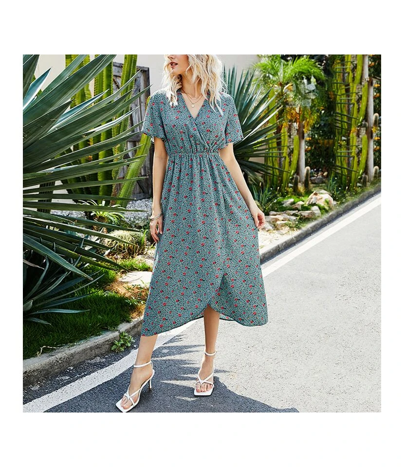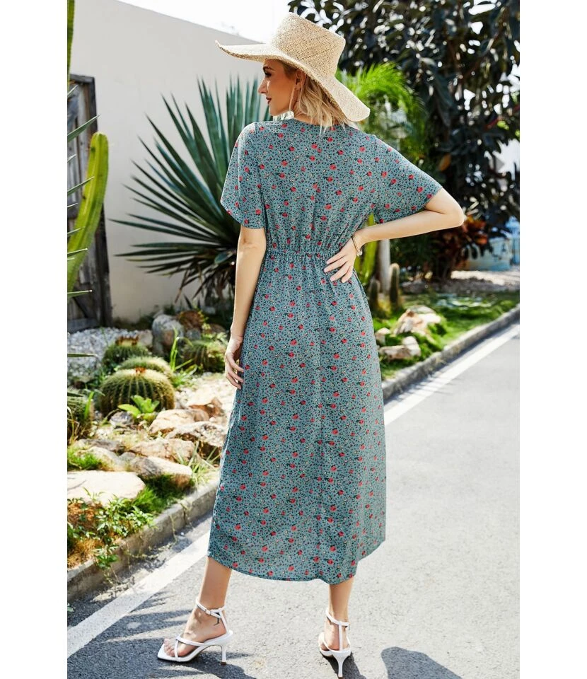 Sexy V Neck Rose Print Split Midi Dress Loose Casual Short Sleeve Wholesale Dresses SD55506