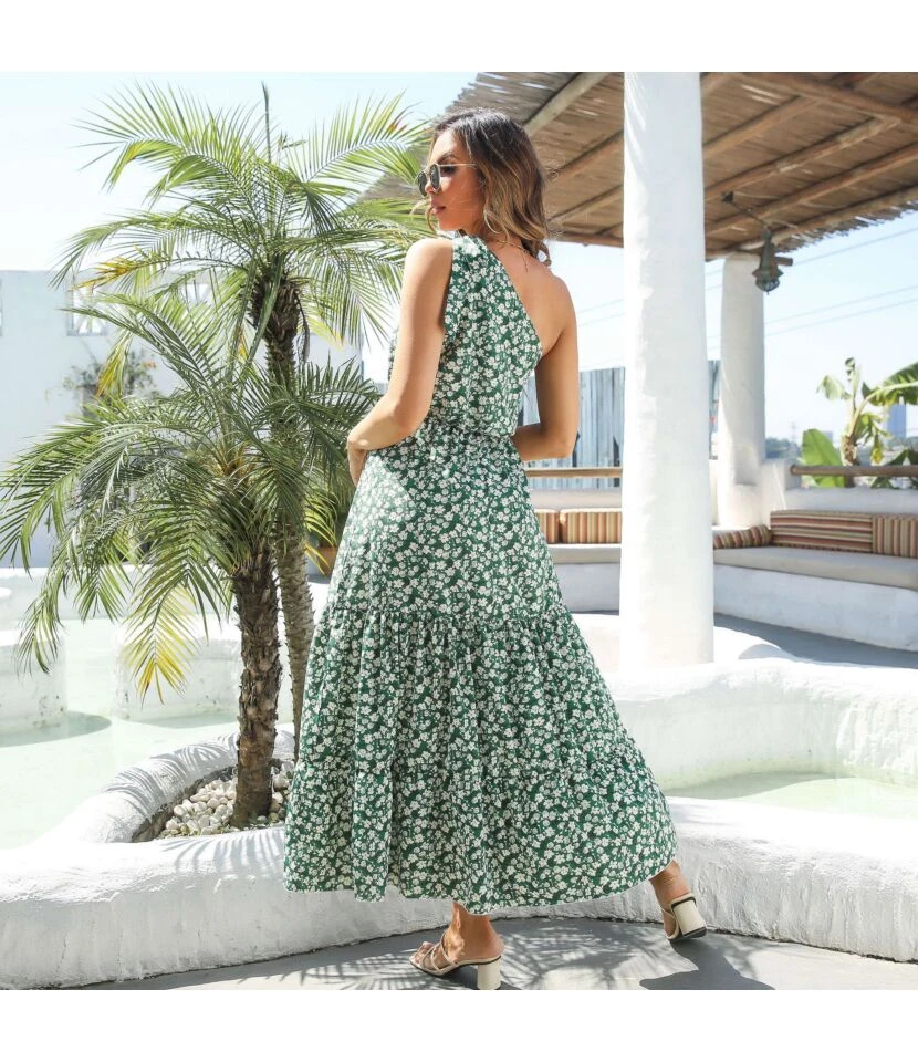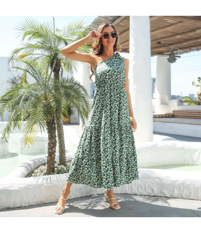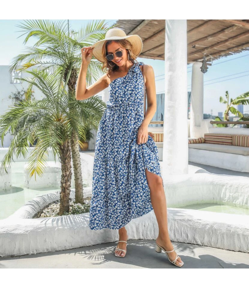 Slanted Shoulder Floral Print Loose Long Smocked Swing Dress Wholesale Dresses N5323030700069
