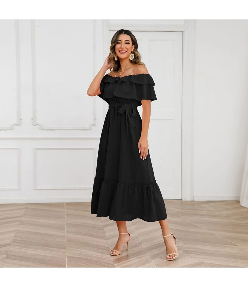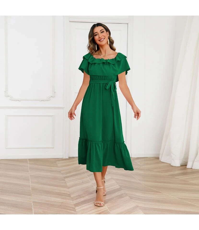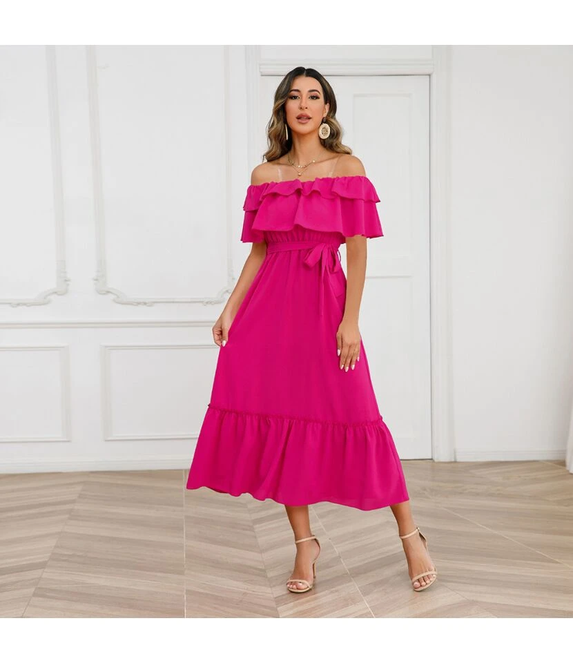 Solid Color Off-Shoulder Lace-Up Waist Mid-Length Ruffle Swing Dress Wholesale Dresses N5323021800028