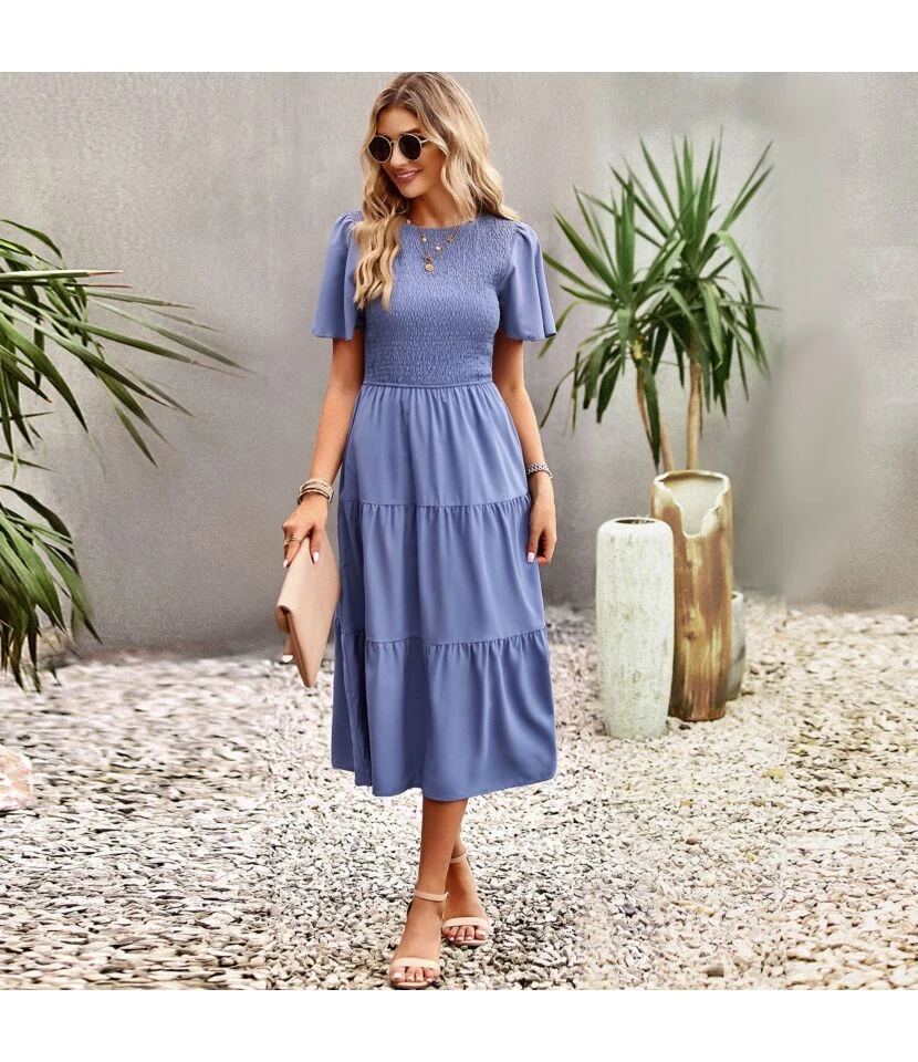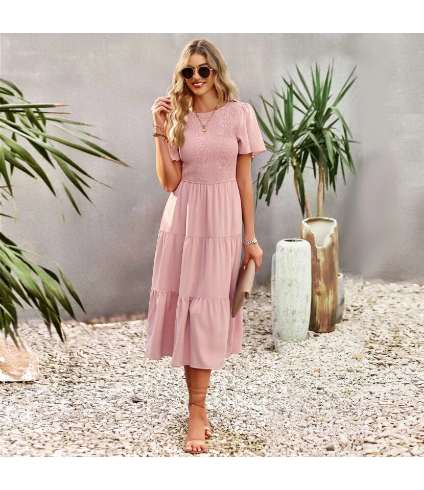 Solid Color Puff Sleeve Slimming Round Neck Smocked Dress Wholesale Dresses SDN539513