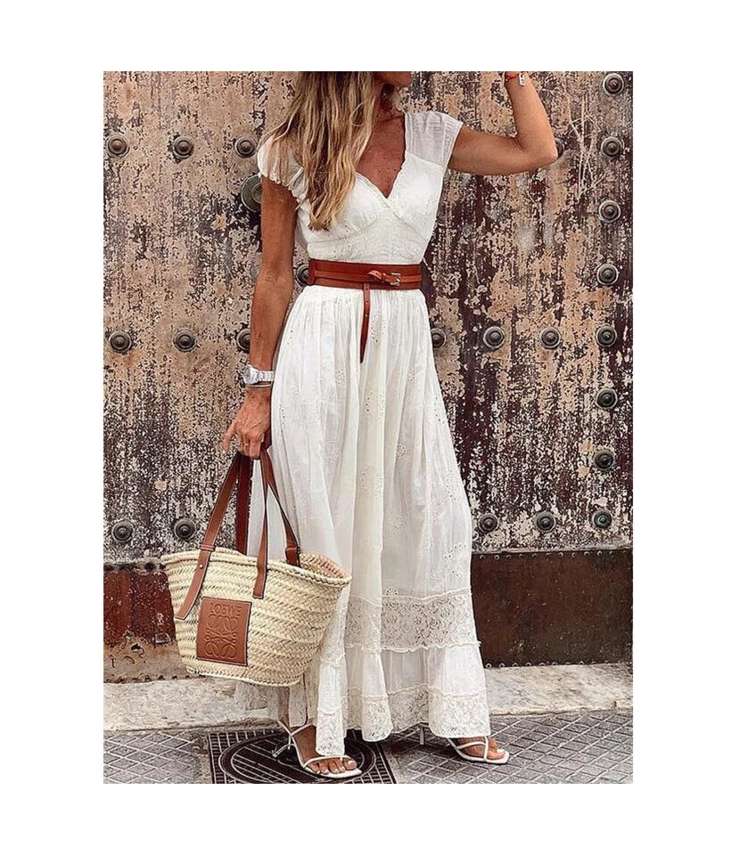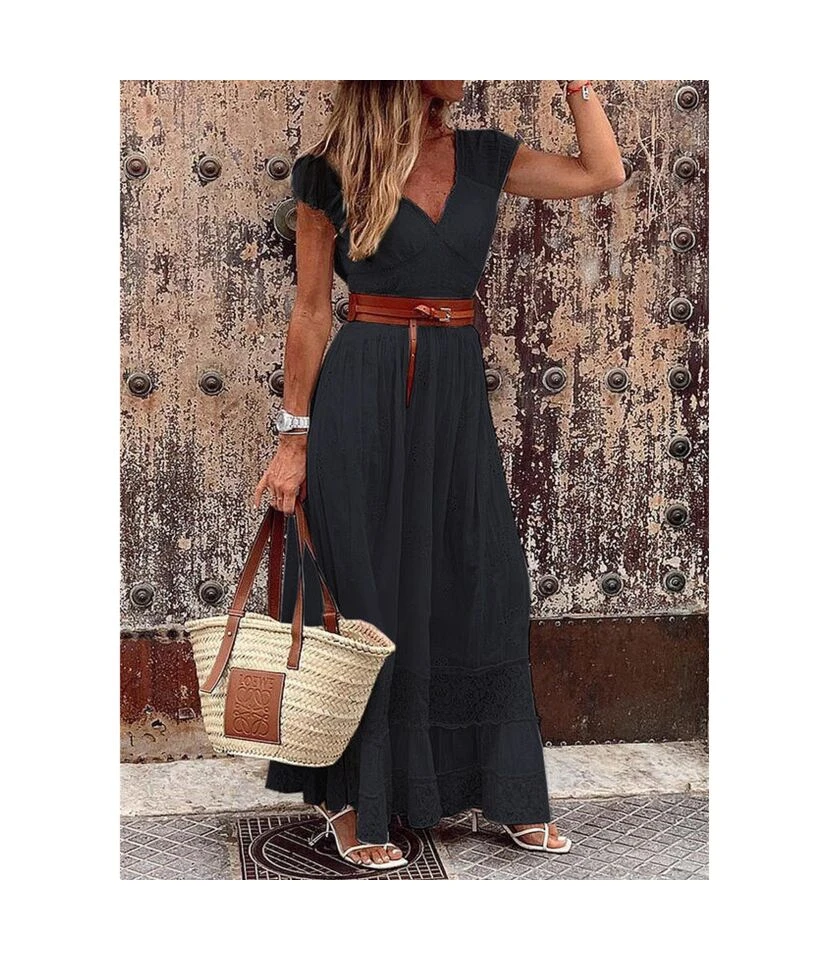 Solid Color Resort V Neck Lace Stitching Swing Maxi Dresses Wholesale Bohemian Dress For Women SDN532782