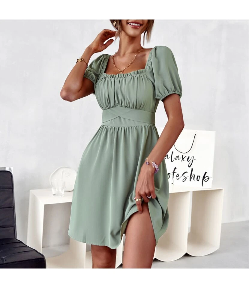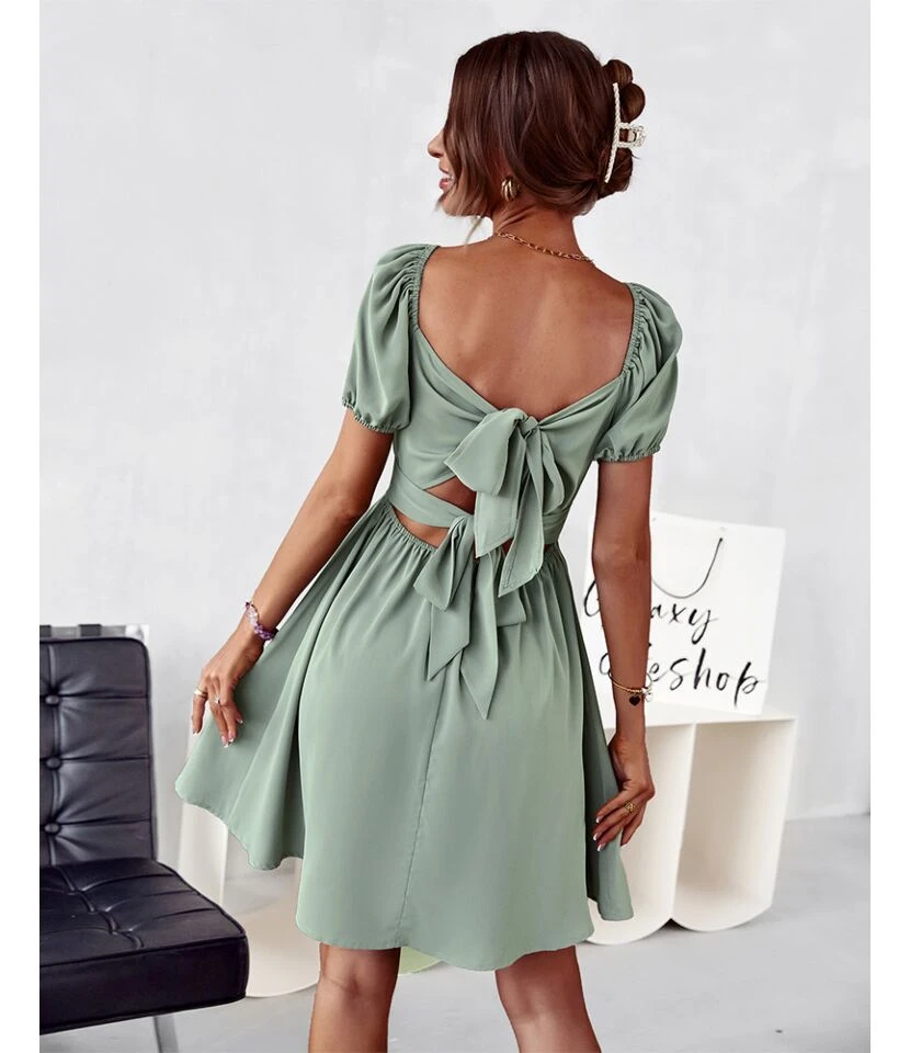 Solid Color Ruffled Square Neck Puff Sleeve Cutout Back Bowknot Swing Dress Casual Wholesale Dresses SDN533153
