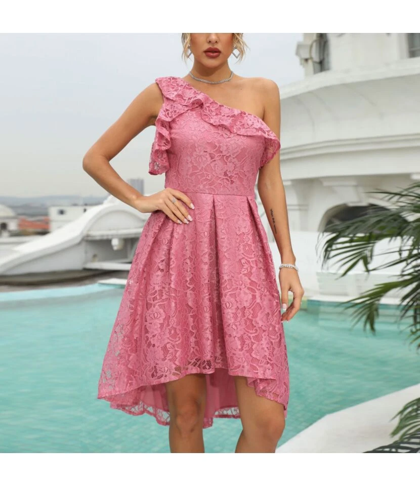 Solid Color Slanted Shoulder Lace Ruffles Swing Evening Dress Elegant Wholesale Dresses SDN532200