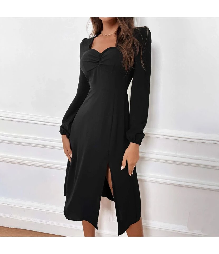 Solid Color V-Neck Slit Long-Sleeve Slim Midi A-Line Dress Wholesale Dresses SDN537343