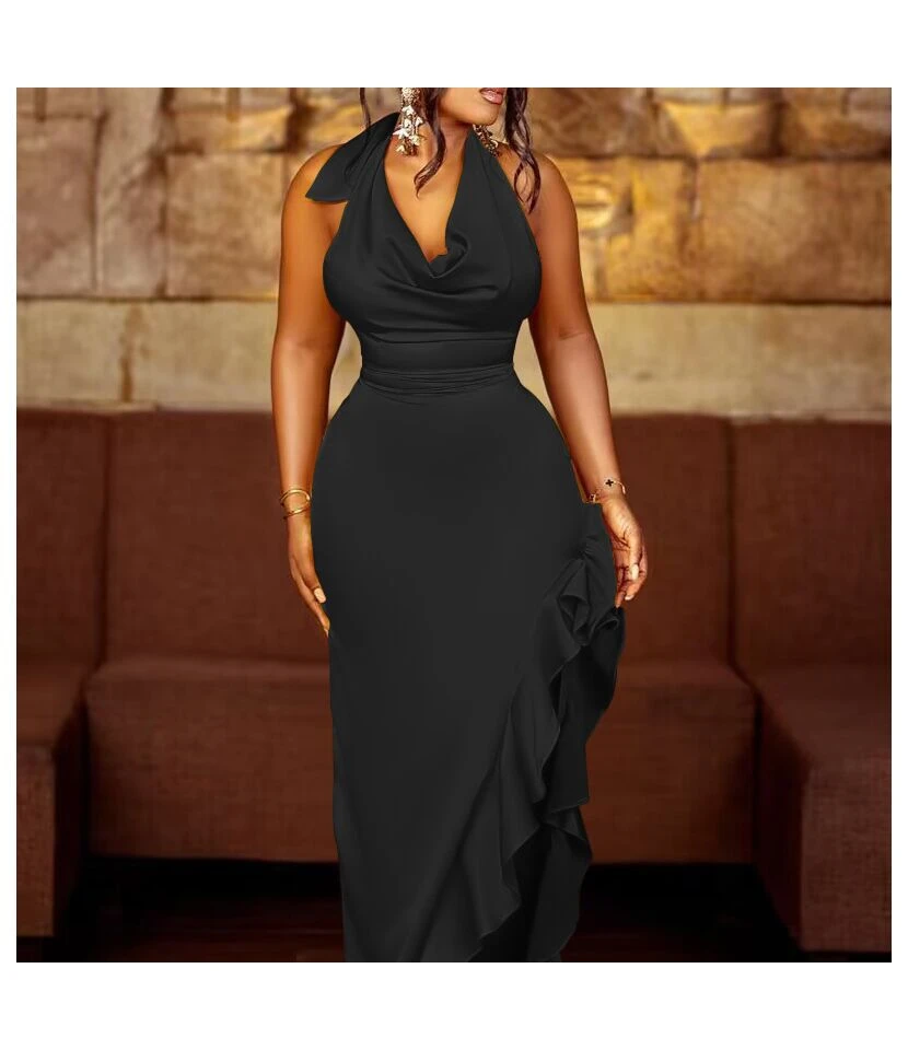 Solid Satin Halter Neck Belted Waist Ruffle Dress Wholesale Womens Clothing N3823110400001